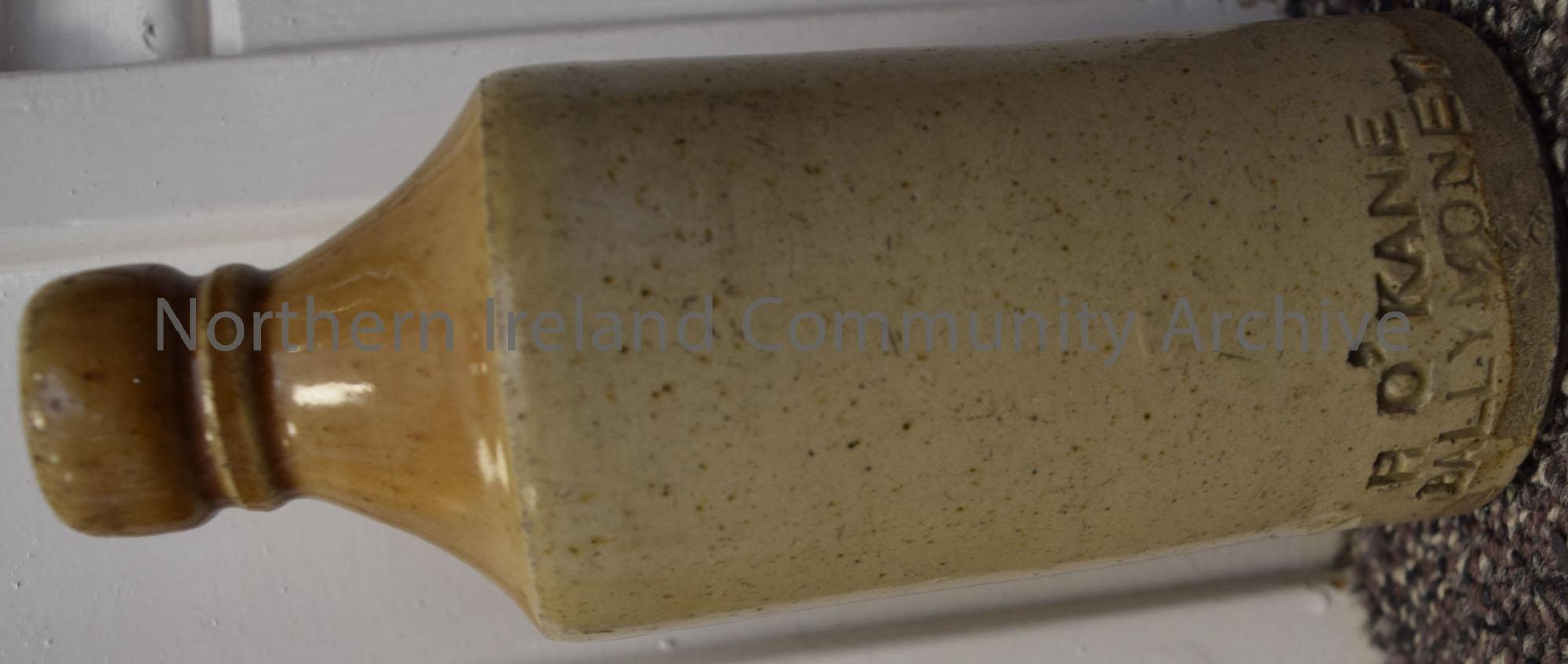 Stout crockery bottle with glzsed finishing. Top of the bottle is dark brown with the rest of the bottle a light brown. The bttom of the bottle is inscribed H. O'Kane Ballymoney. Some wear and tear on bottom of bottle thats lost its glazing