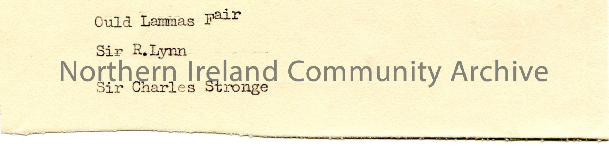 Strip of paper with ‘Ould Lammas Fair, Sir R. Lynn, Sir Charles Stronge’ typed on it.
