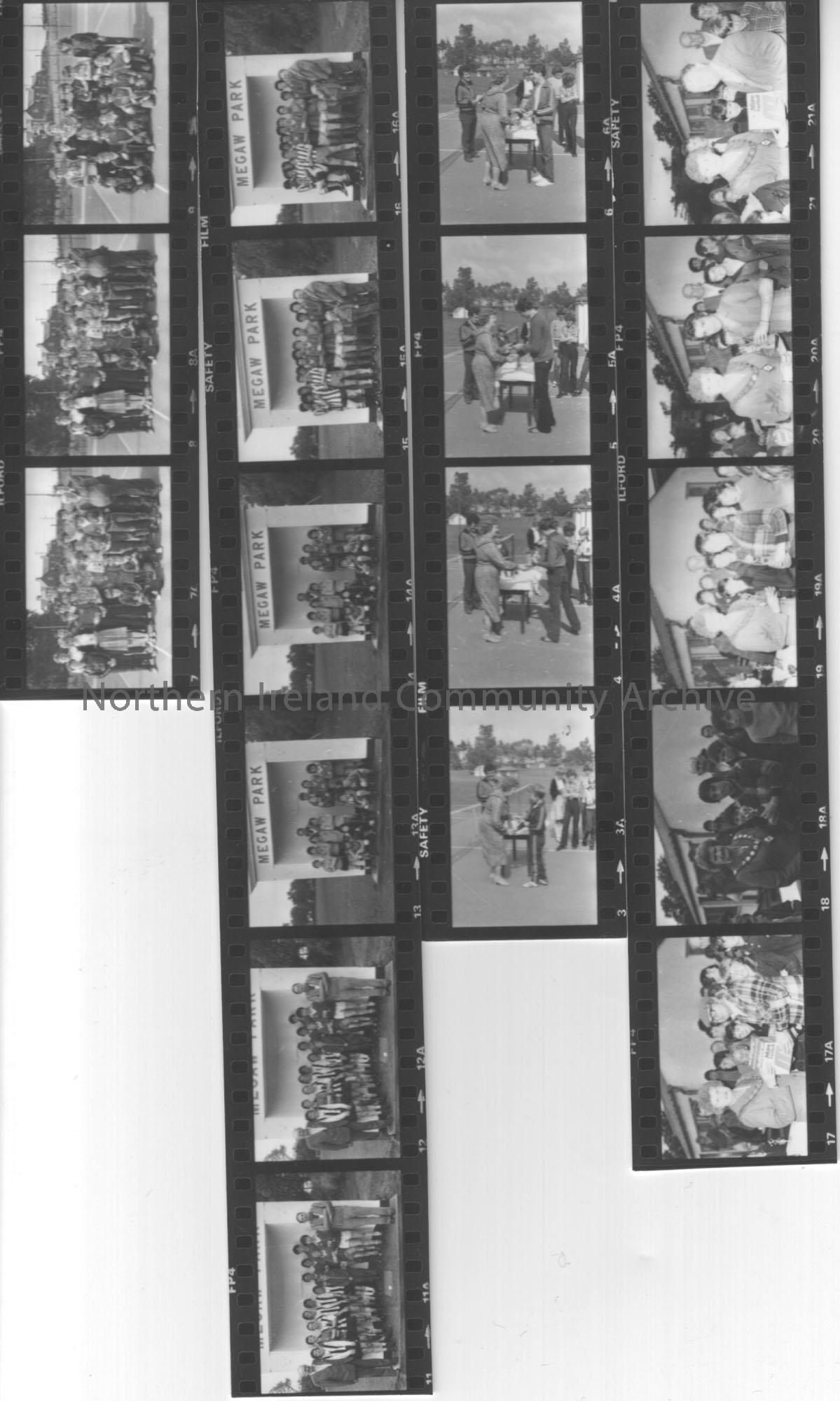 strips of negatives-Mayoress and group at Megaw park, winning ceremony
