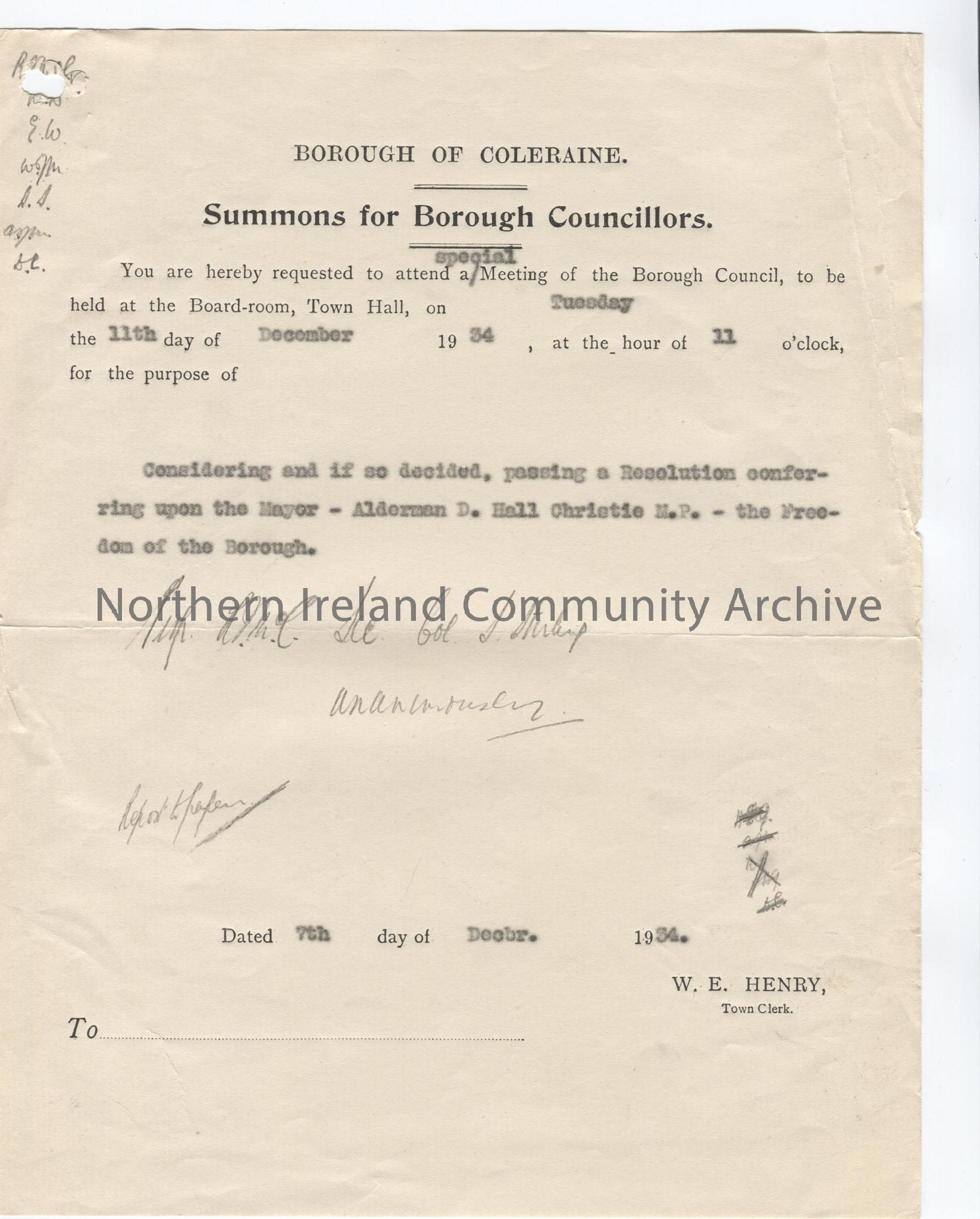 Summons for Borough Councillors - Borough of Coleraine. Requesting Councillors to attend a special meeting to be held at the Board Room in the Town Hall on Tuesday 11th December 1934 at 11am to discuss Freedom of the Borough for the Mayor Alderman D. Hall Christie.