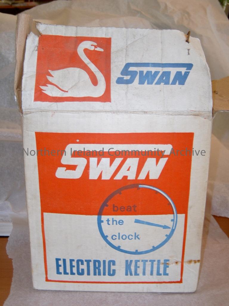 swan electric kettle in original 'beat the clock' box. Stainless steel kettle with wire and plug attachment. Large plastic handle. Included in the box is a swan guaranee for the kettle and an advertisement for the swan coffee maker and other swan products