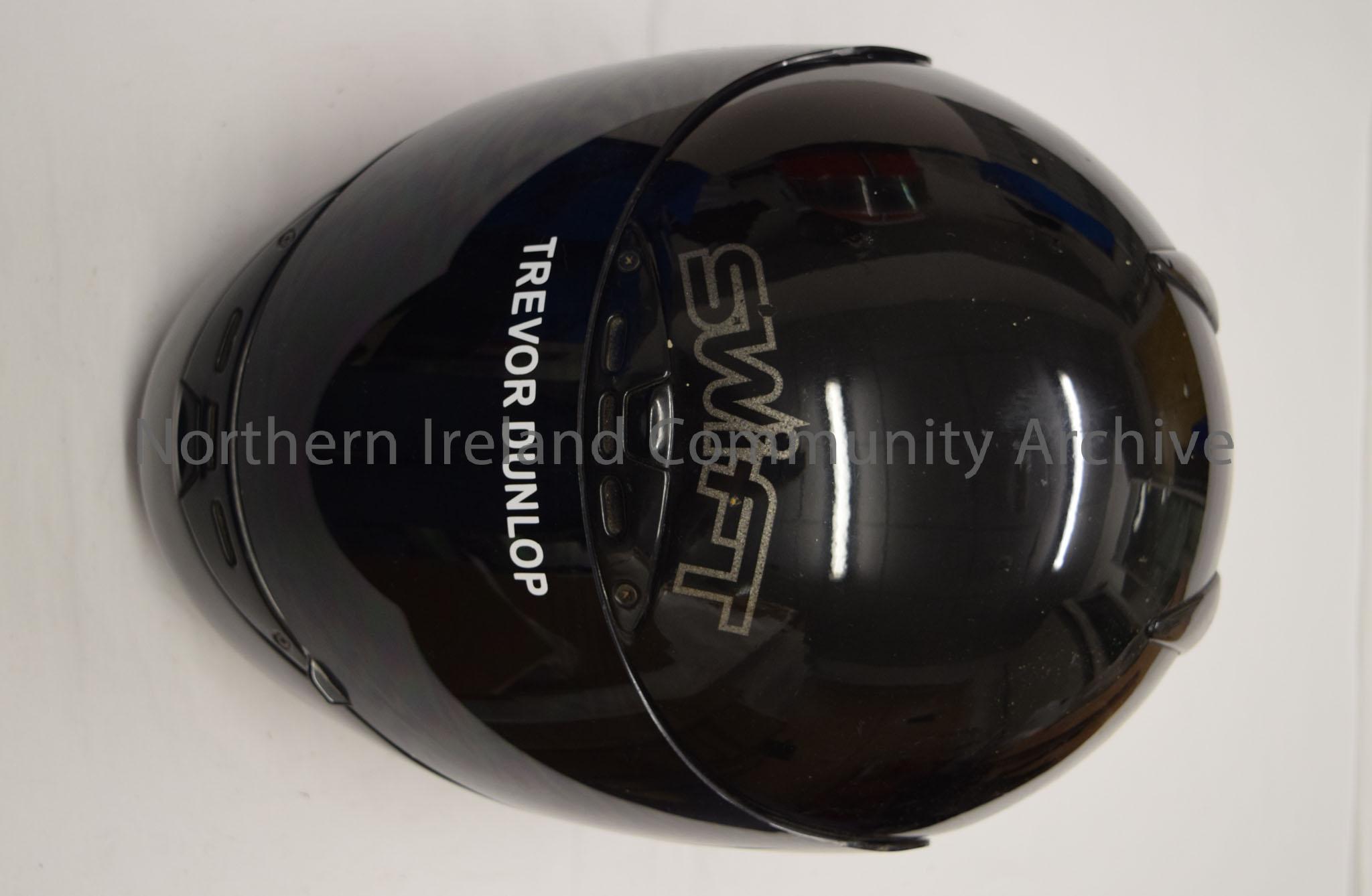 Swift motorcycle helmet belonging to Trevor Dunlop. Completely black helmet with Road Racing Ireland sticker on the back.