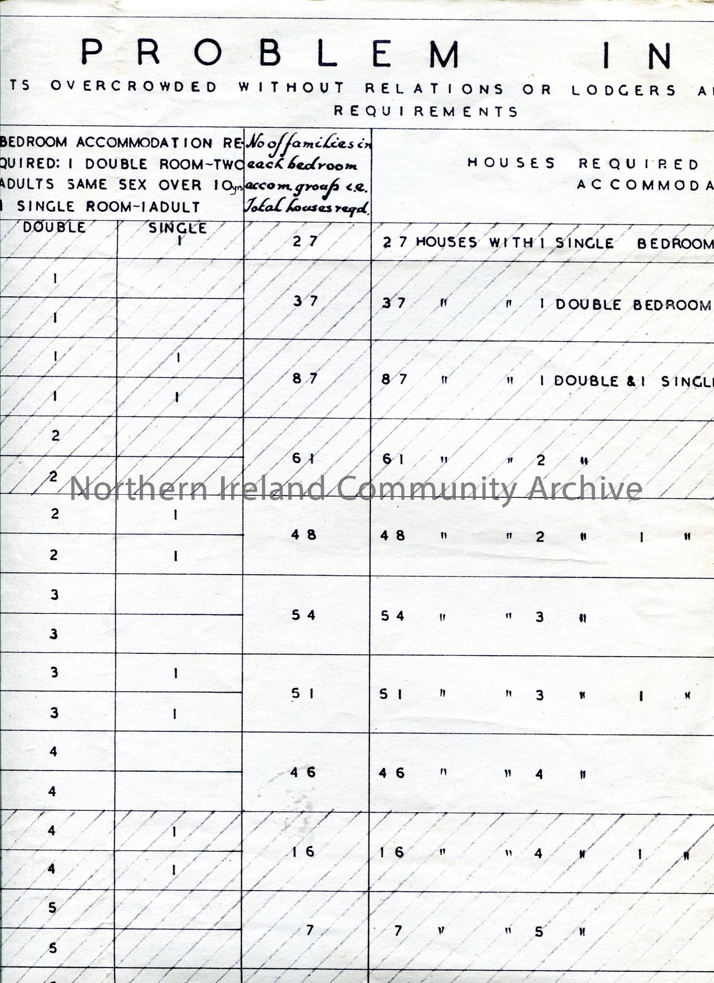 Table of figures of information on large page re 'Housing Problem In Coleraine'. By James V T Scott, Town Planning Architect. Dated 28th April 1945.