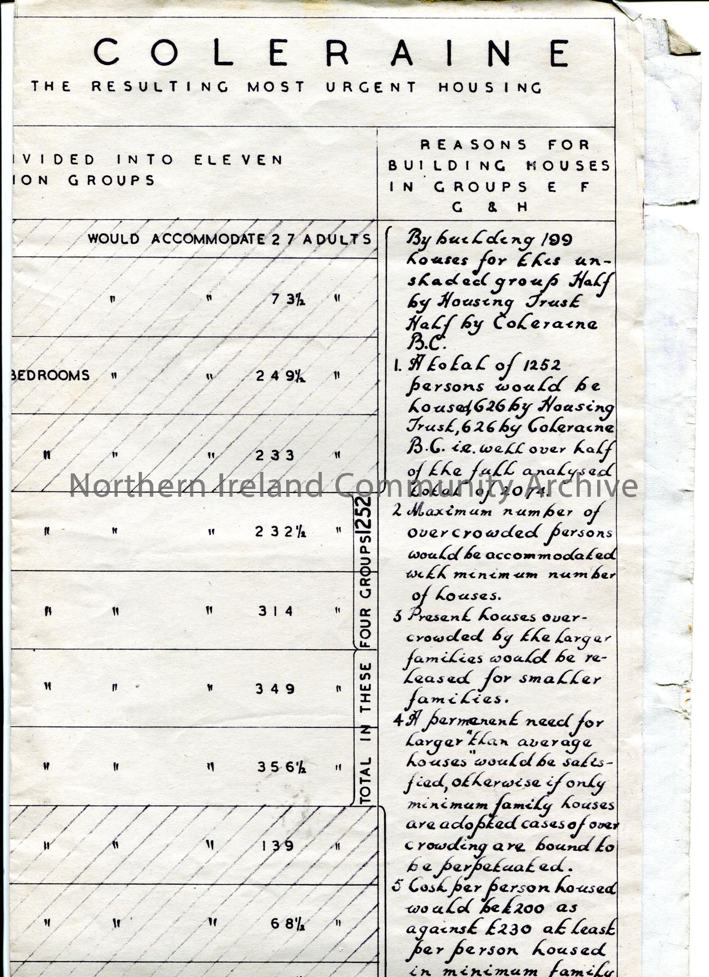 Table of figures of information on large page re ‘Housing Problem In Coleraine’. By James V T Scott, Town Planning Architect. Dated 28th April 1945. – scan026c