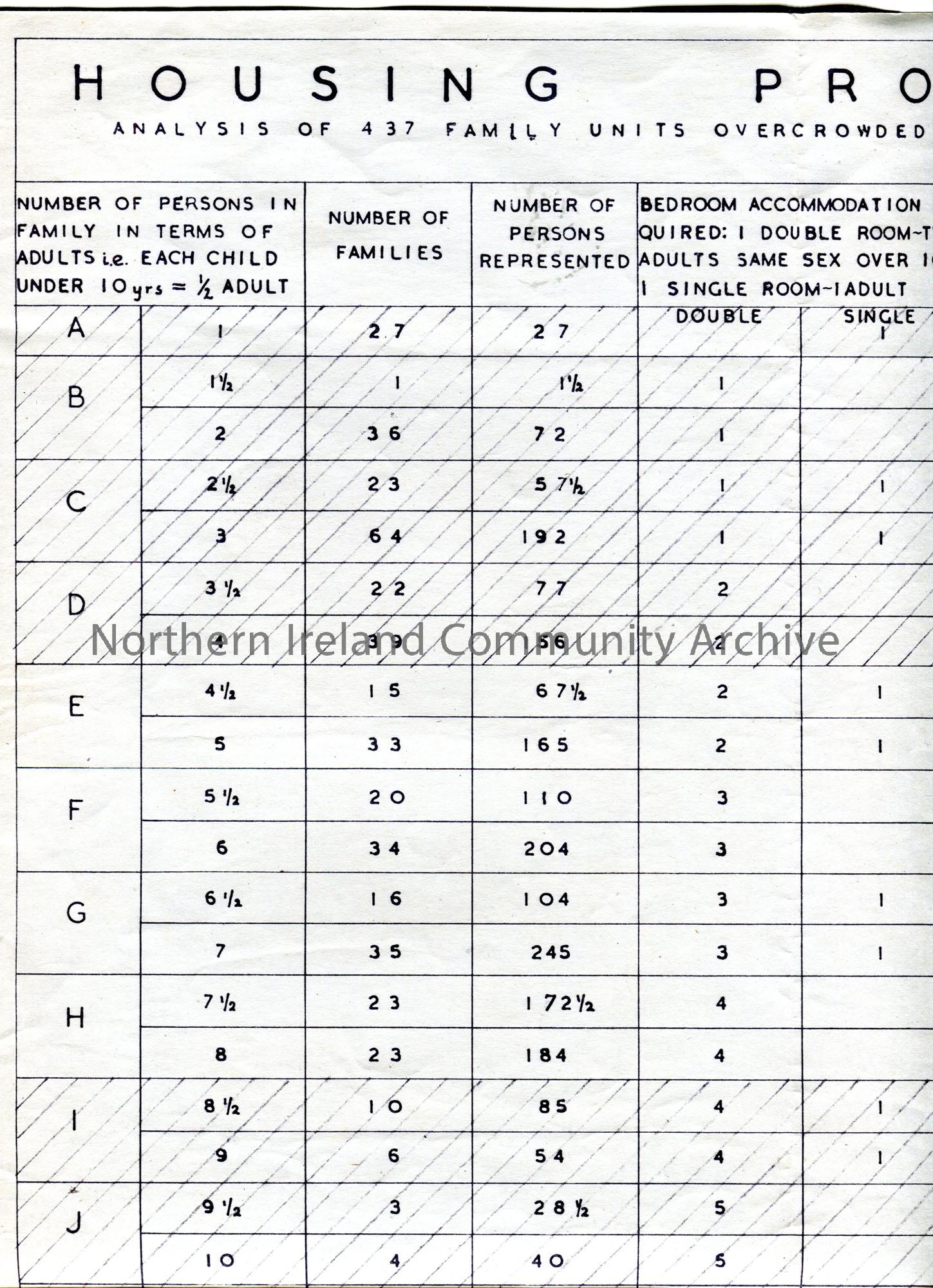 Table of figures of information on large page re ‘Housing Problem In Coleraine’. By James V T Scott, Town Planning Architect. Dated 28th April 1945.