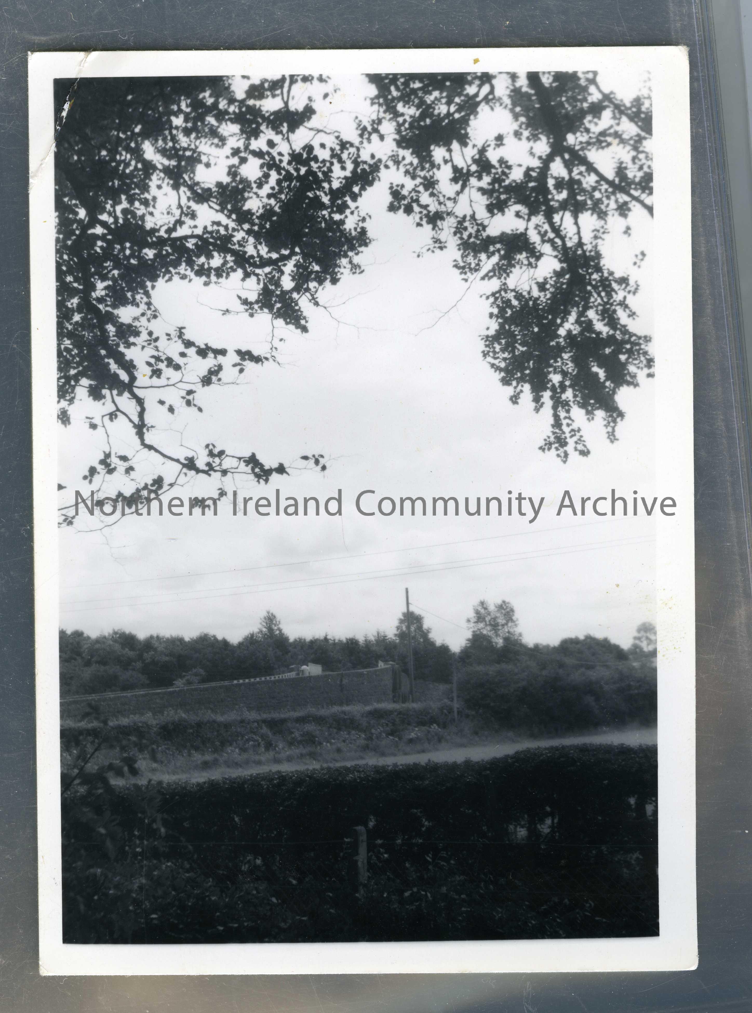 Taken from under a tree looking across a road to a stone wall and bridge ?