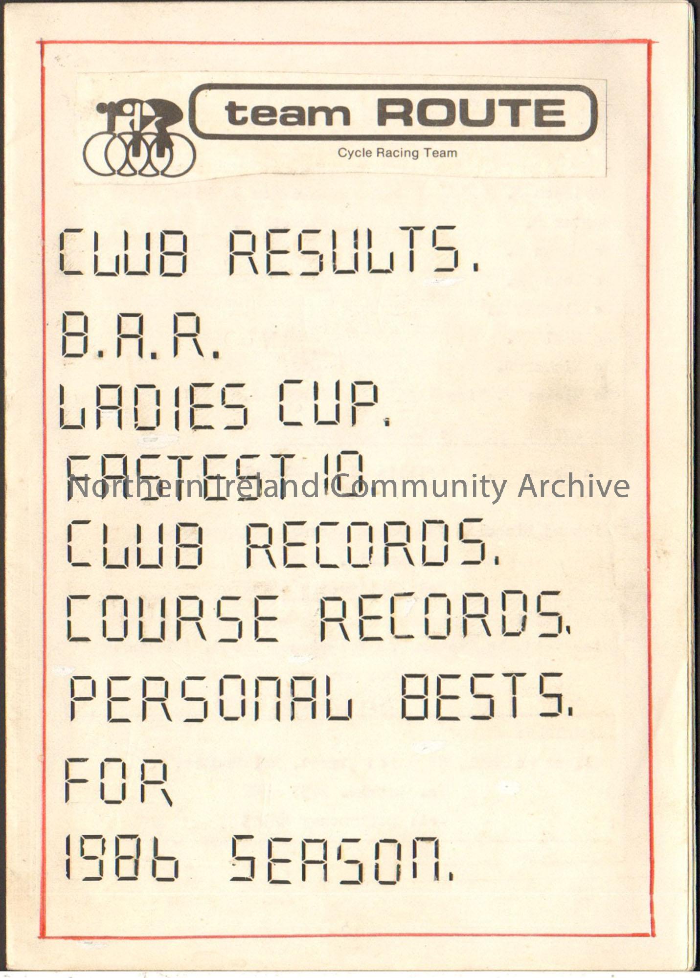 Team Route 1986 season. Club results, B.A.R, Ladies Cup, Fastest 10, Club Records, Course Records, Personal Bests. White booklet with Team Route logo …