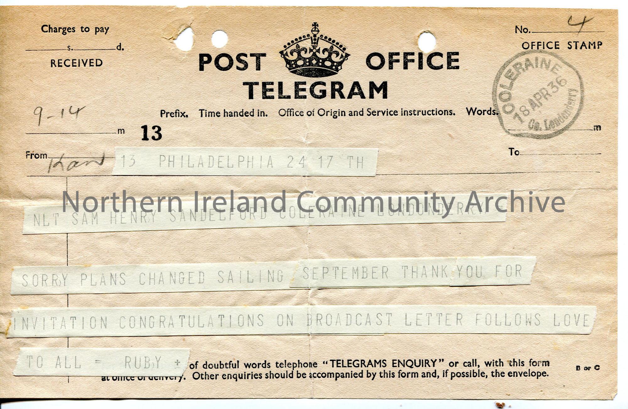 Telegram from Philadelphia, USA from a Ruby – sailing later and congratulations on broadcast