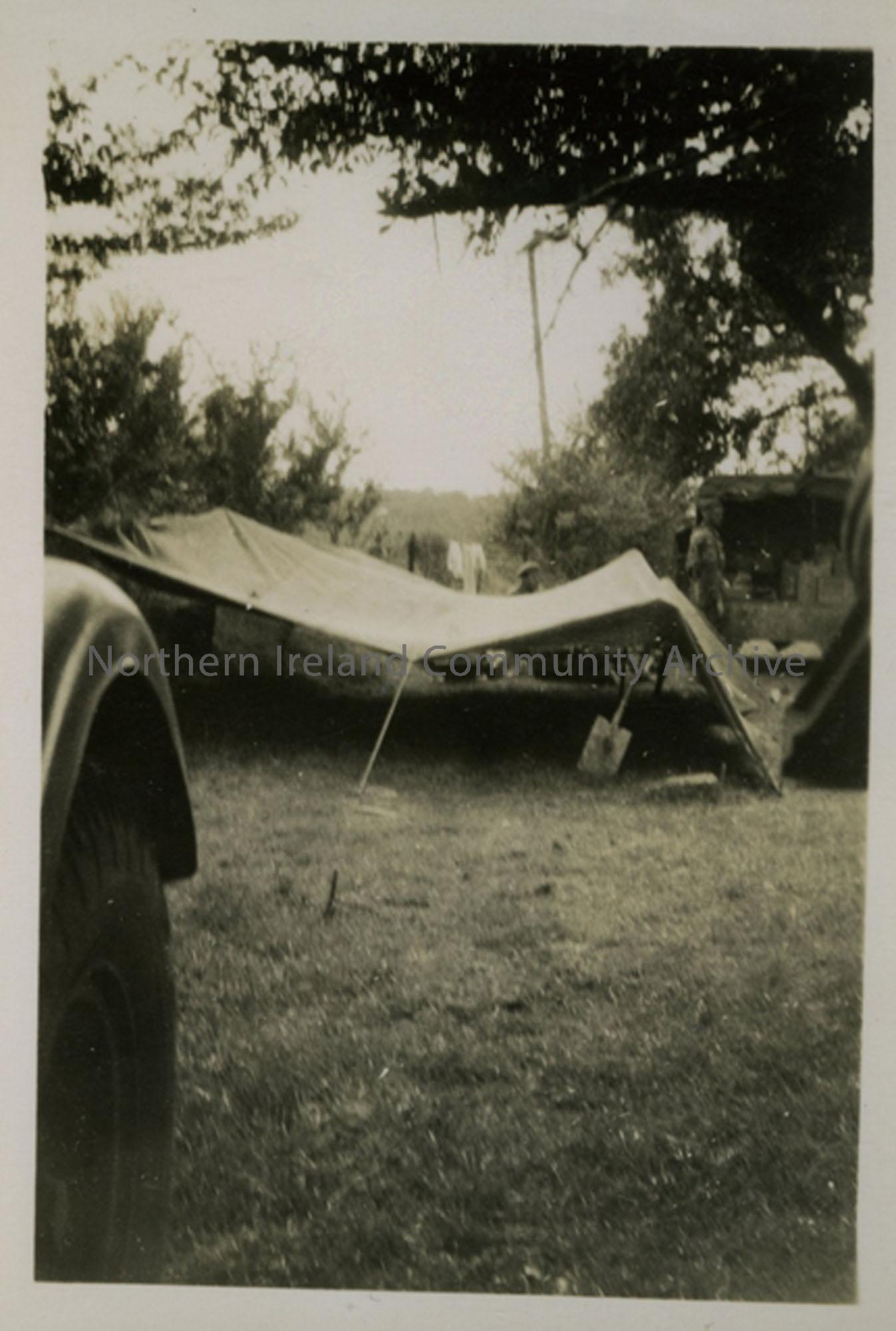 Photo of a tent in the countryside with troops from 6 Light Anti-Aircraft Battery resting in the Orchard.