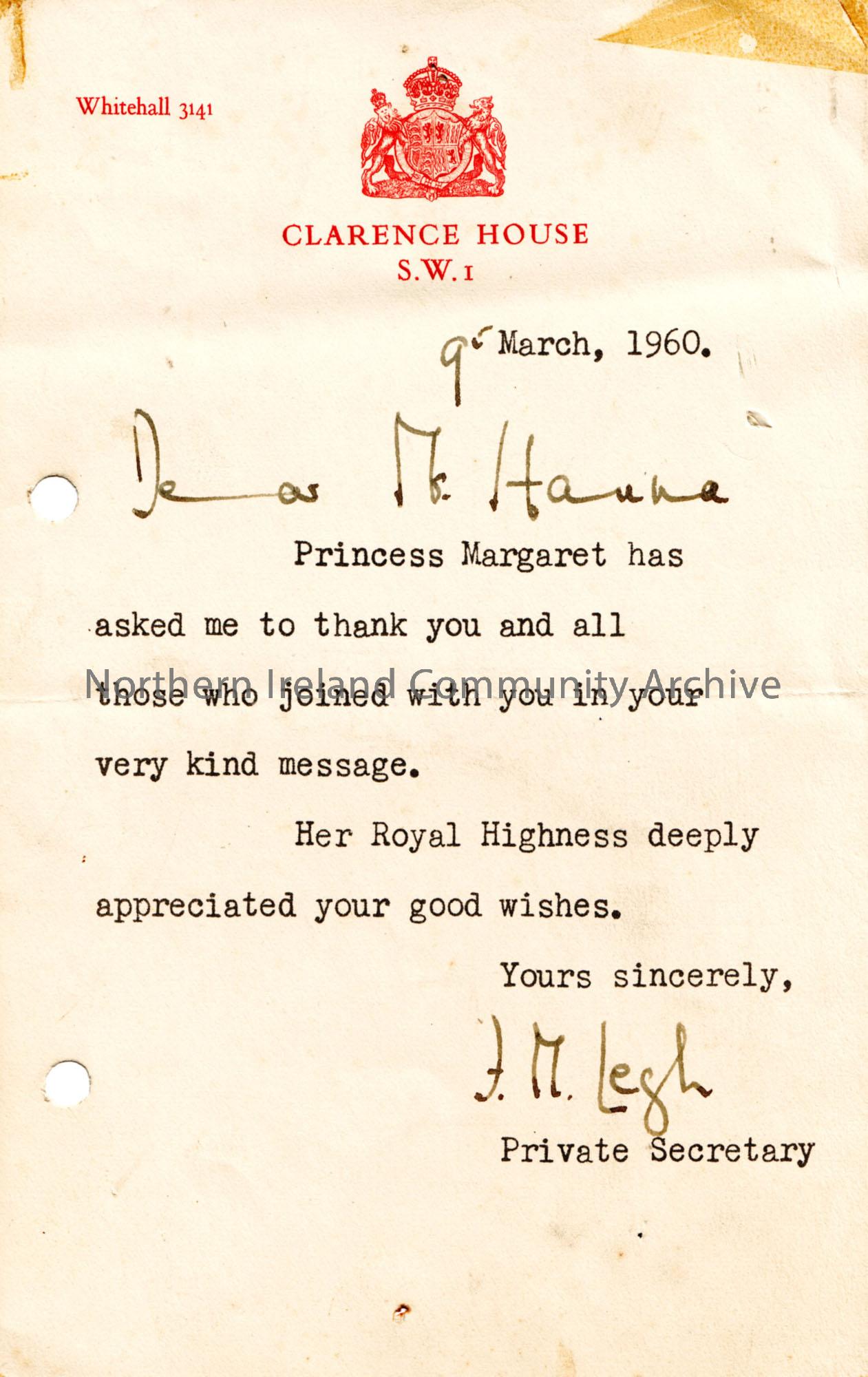 Thank-you letter on behalf of Princess Margaret to Mr Hanna of Ballymoney Council on headed paper showing Royal Crest