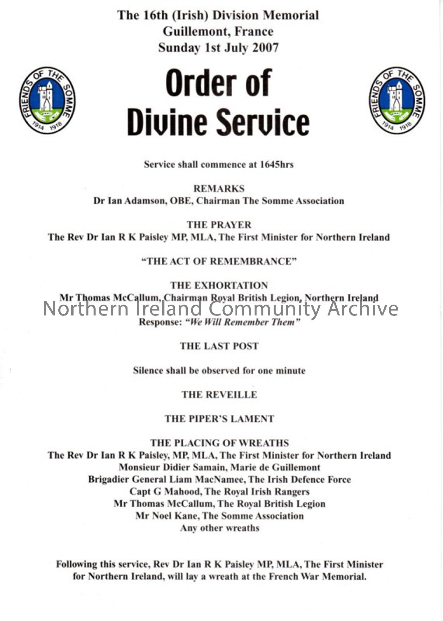 The 16th (Irish) Division Memorial Guillemont, France Sunday 1st July 2007, Order of service.