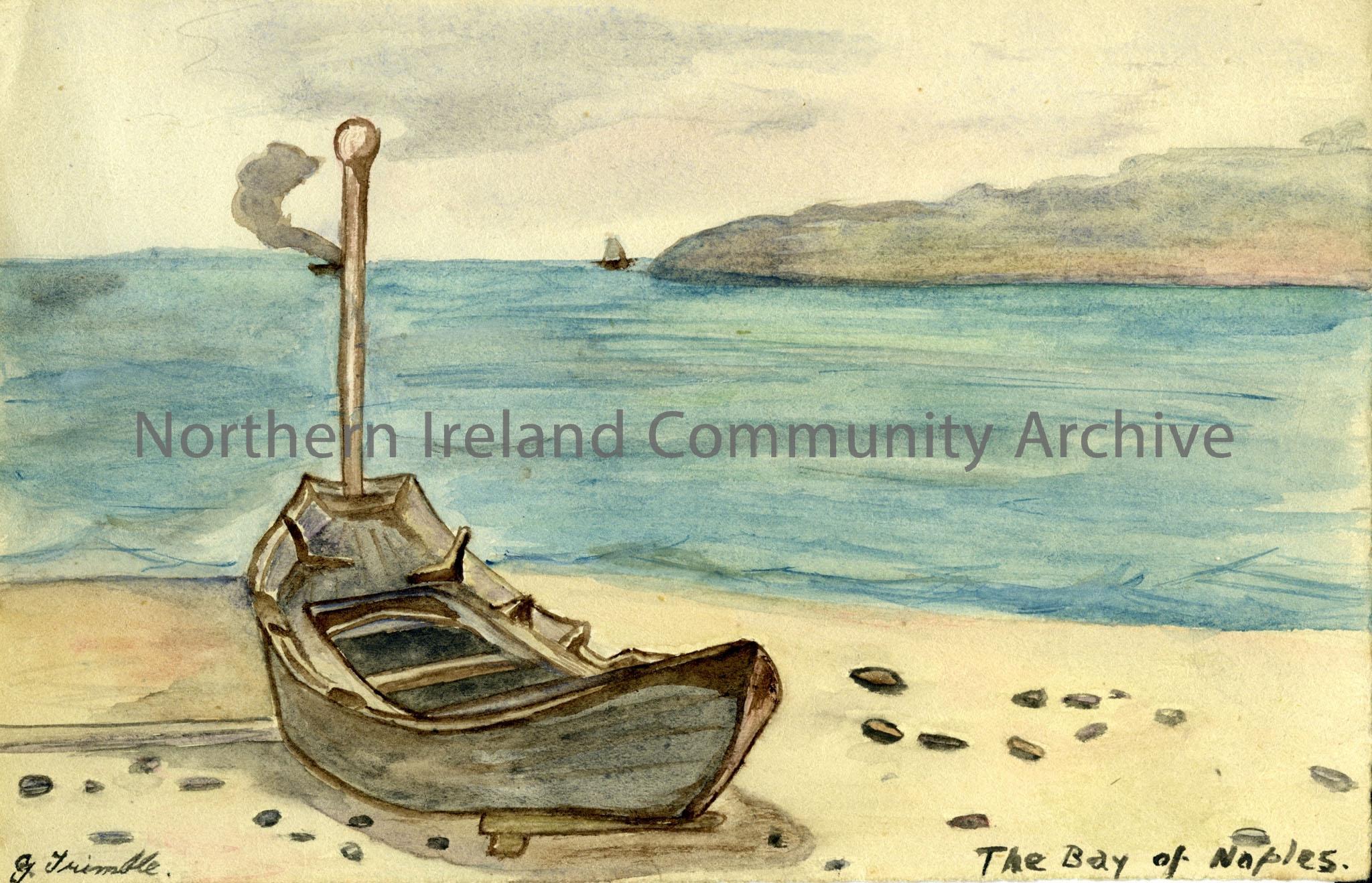 Small landscape watercolour titled, 'The Bay of Naples' by Gertrude Trimble. A wooden boat is in the foreground sitting on a beach. You can see mountains on the horizon