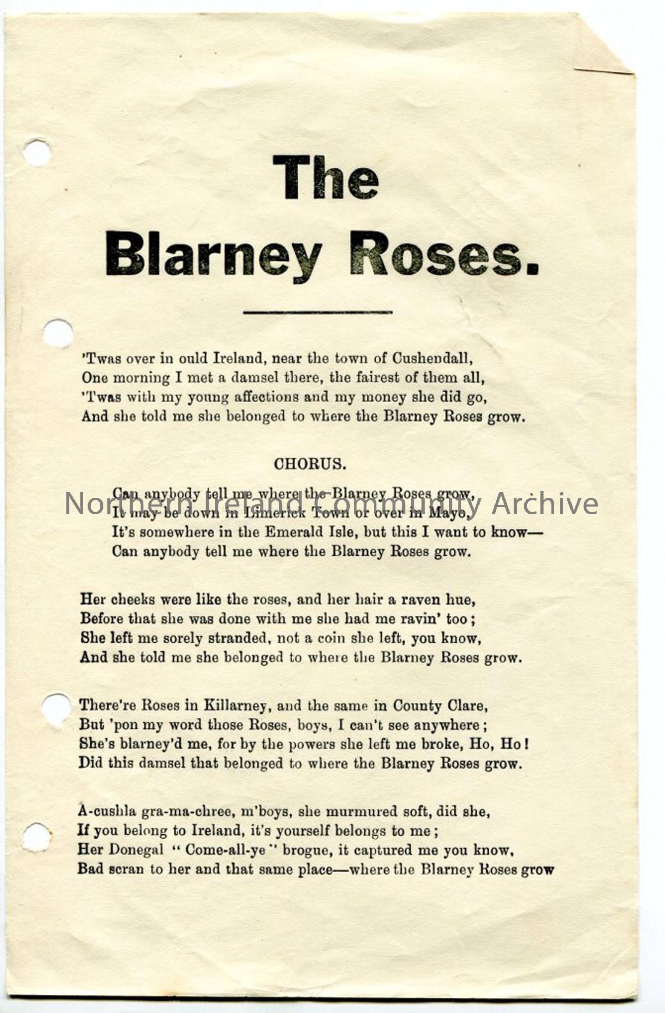 Printed words to 'The Blarney Roses'. Uses local dialect. Mentions Cushendall, Tralee, Killarney and Donegal.