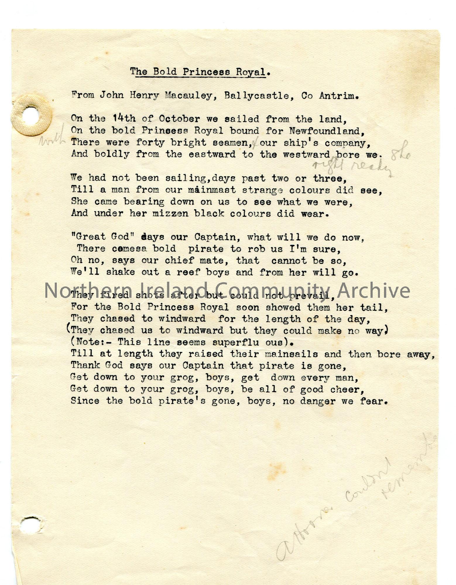 Typed words to 'The Bold Princess Royal'. From John Henry MacAuley, Ballycastle, Co. Antrim. Probably John MacAulay, the 'Bog Oak Carver'.