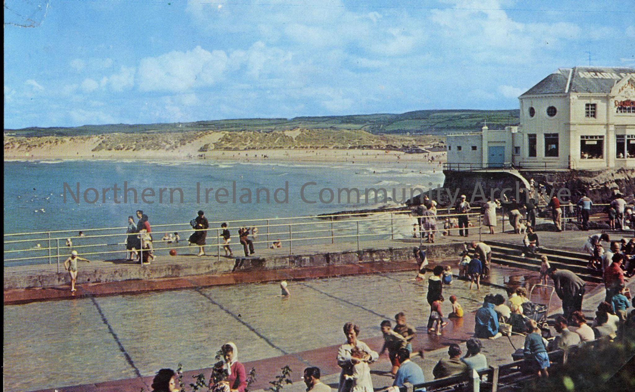 postcard depicting the childrens paddling pool in Portrush at the Arcadia with beach in the background. Crowd of adults and children round the pool