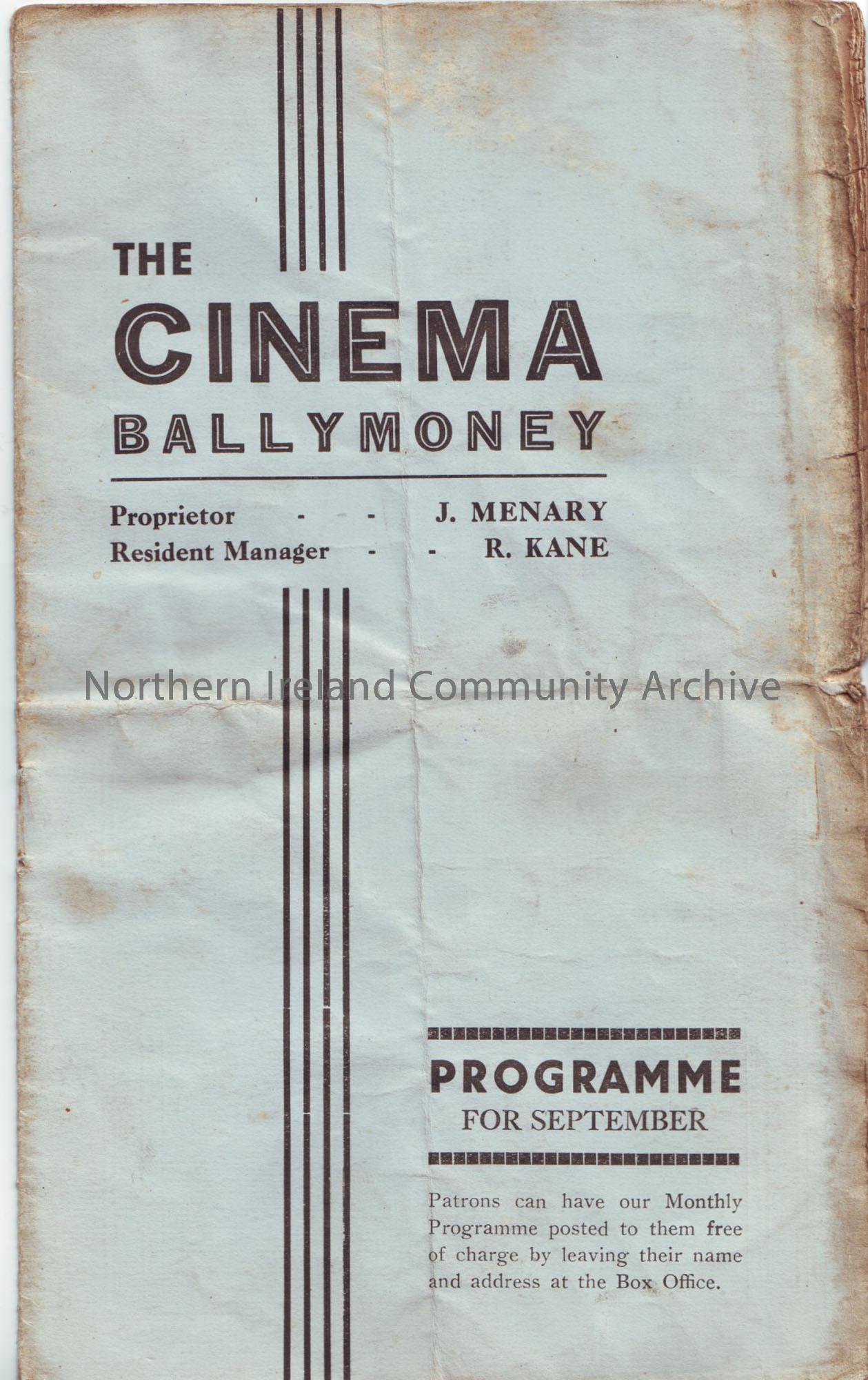 The Cinema, Ballymoney. Proprietor-J Menary, Resident Manager-R.Kane. Programme for September 1936