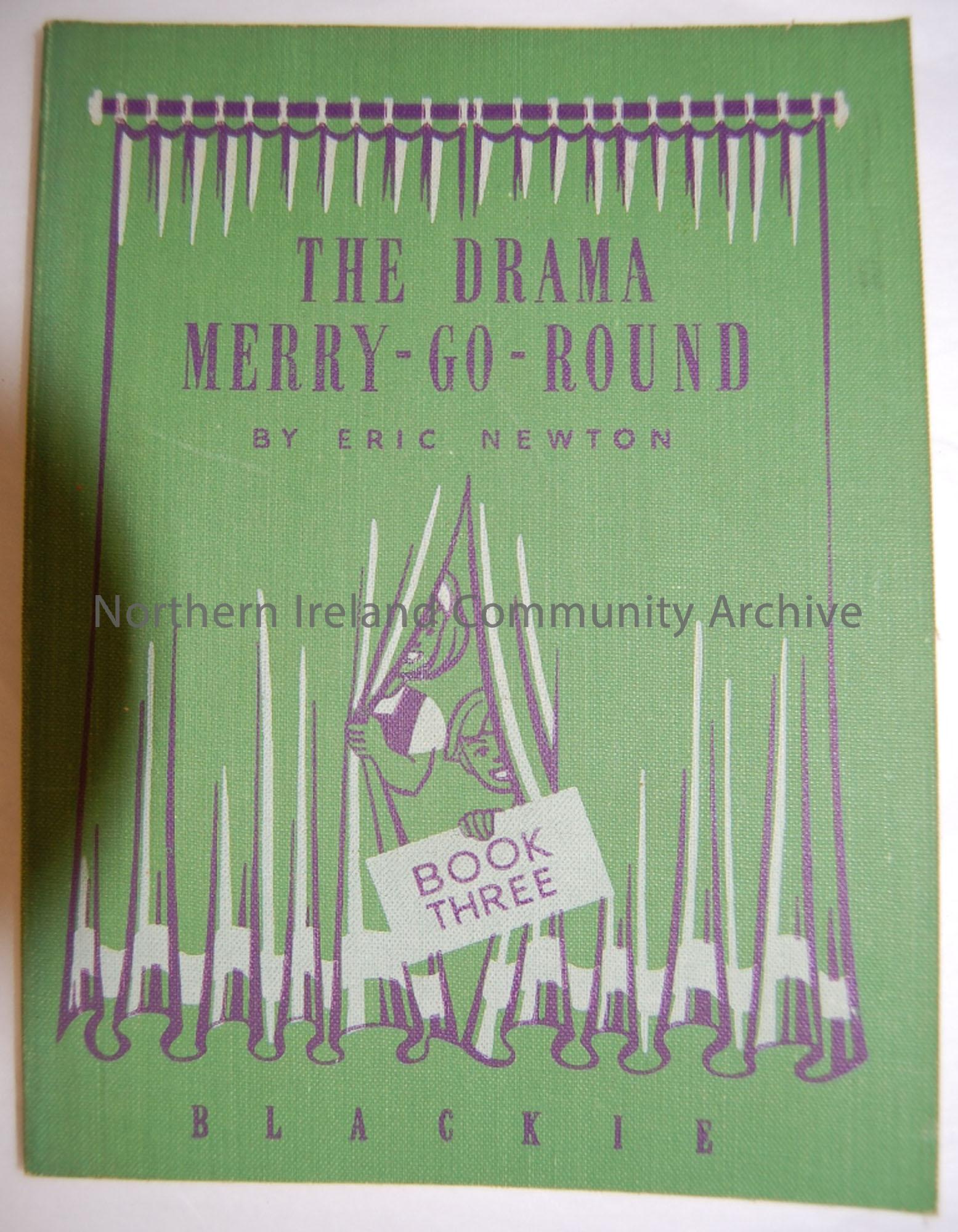 ‘The drama Merry-go-round’ by Eric Newton, printed by Blackie and Sons Ltd. Green cover with illustration of two children and theatre curtain.