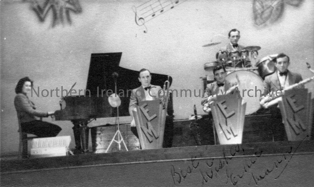 The Ernie Mann band was a popular showband in the Portrush area in the 1940s. The band performed at locations around the coast. This included Barry’s Amusements, which had introduced dancing in a ‘ballroom’ constructed adjacent to the dodgems track c.1947. The Ernie Mann band was the first resident band at Barry’s. The ballroom closed in 1952. Other dance halls in the area remained popular with young people in 1940s and 1950s.