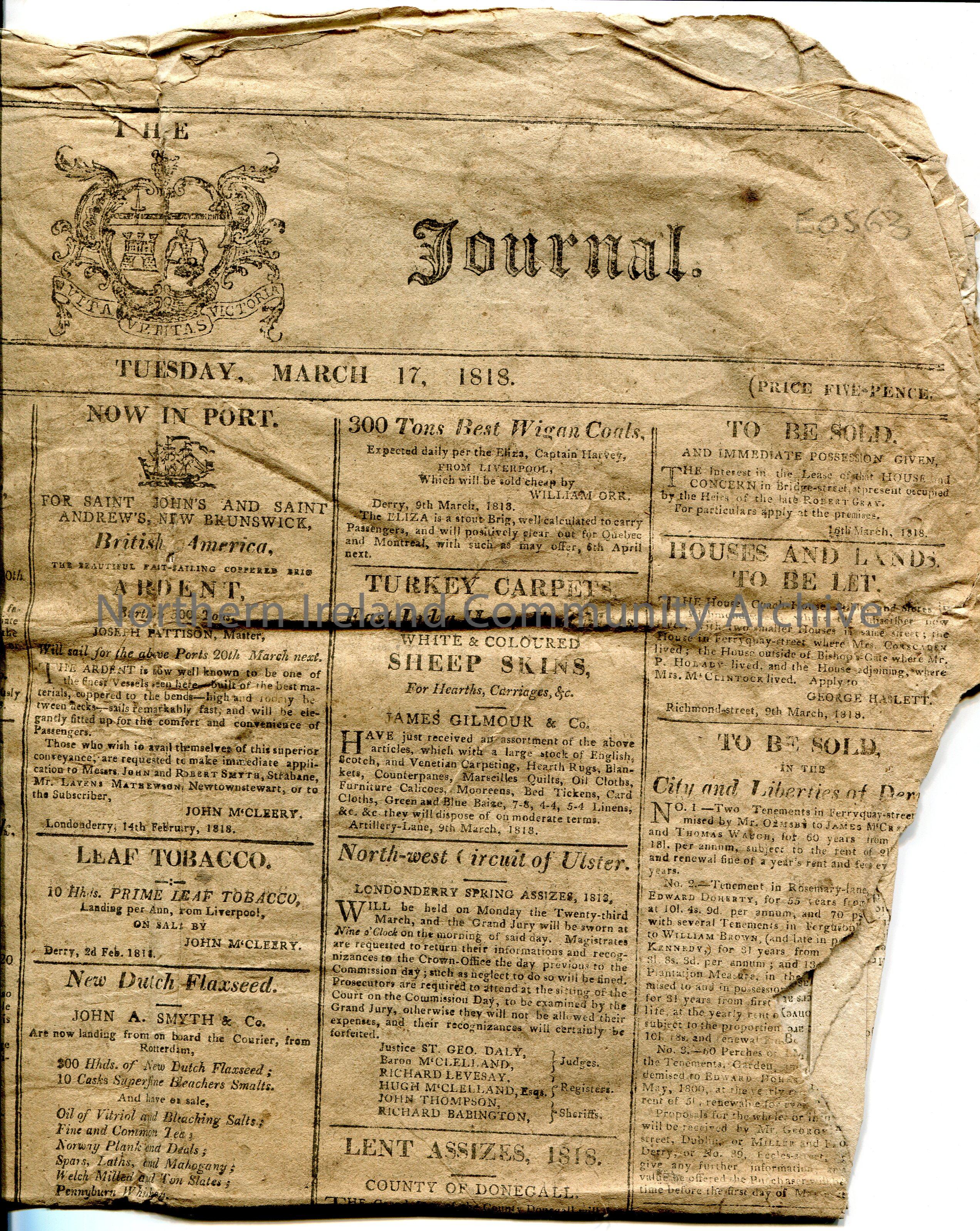 The front and back ? page of the 'L:Derry Journal' newspaper. Dated Tuesday, 17th March, 1818. Vol. XLV. - No 3413. Contains news items and advertisement of goods for sale. 'Old leases' handwritten vertically lower and upper left side of front page.