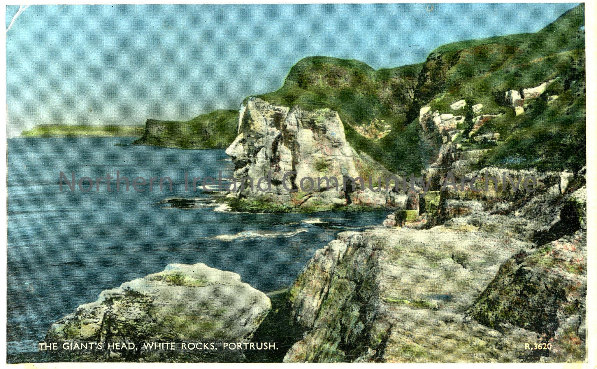 Postcard depicting The Giants Head, White Rocks, Portrush. With grass ontop of cliffs looking out to sea