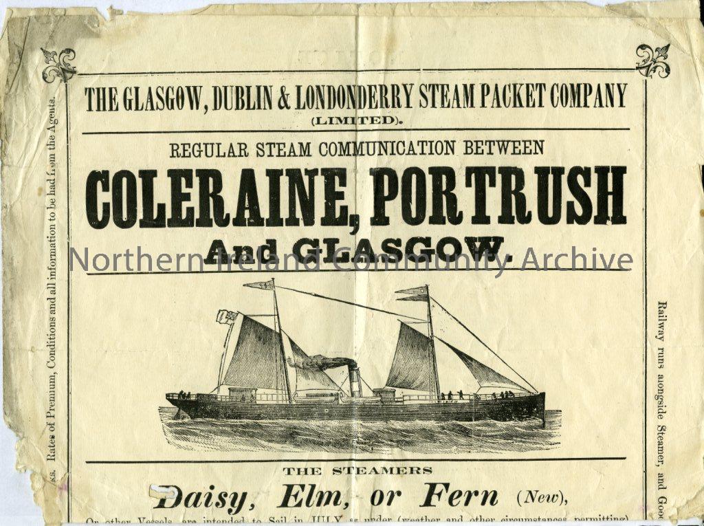 The Glagow, Dublin & Londonderry Steam Packet Company, poster and timetable of steam boat connection between Glasgow, Coleraine and Portrush. 1901