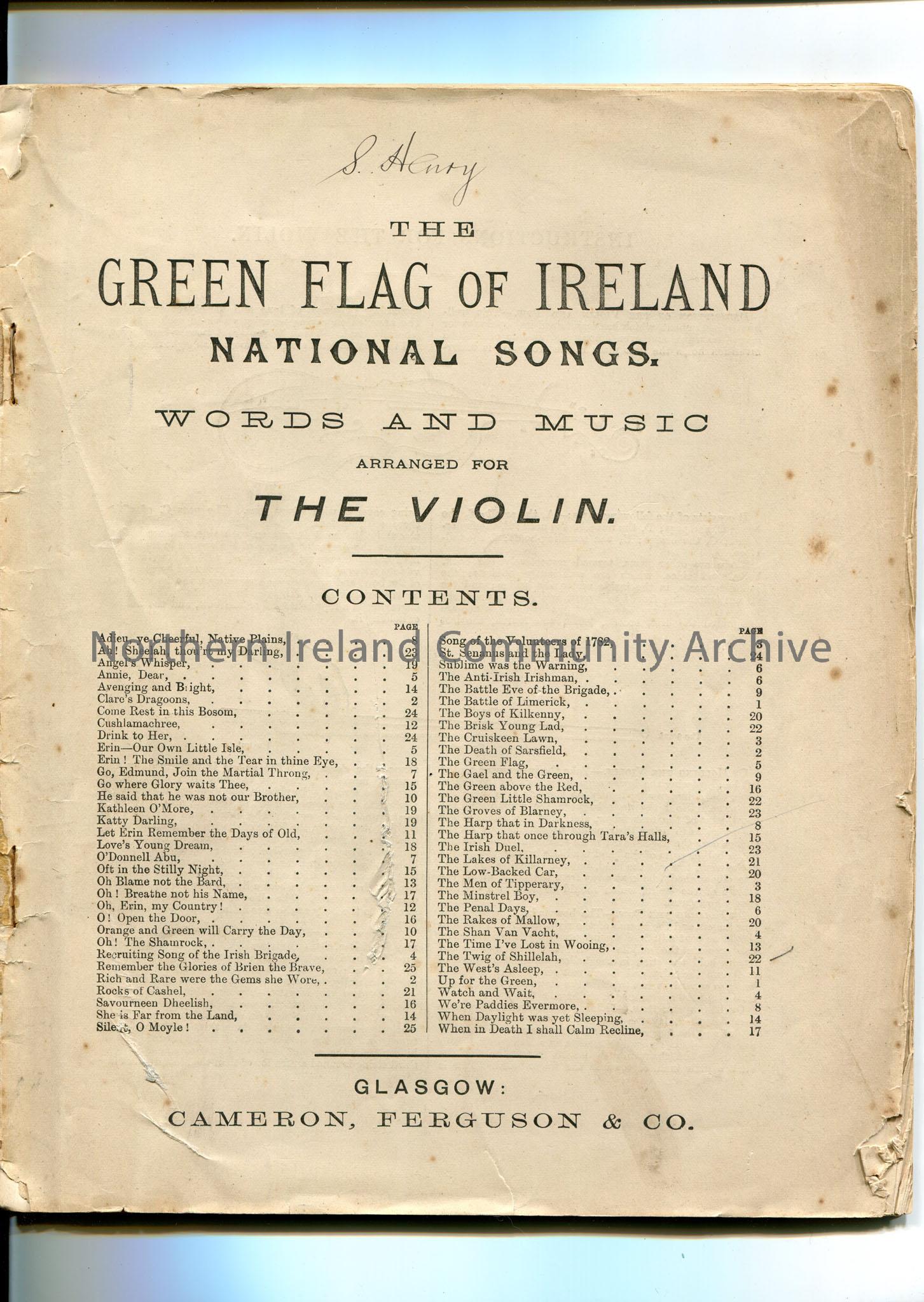 'The Green Flag of Ireland National Songs'. (Front cover missing) Words and music arranged for the violin. Published by Cameron, Ferguson & Co, Glasgow. 'S. Henry' written at top of front page. Manuscripts and words to songs. Some songs are ticked and 'good' written beside them in pencil.
