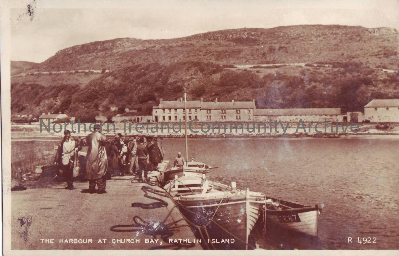 postcard depicting the harbour at Church bay, Rathlin Island. With fishermen and fishing boats moored at port. Houses in the background, hills and trees.
