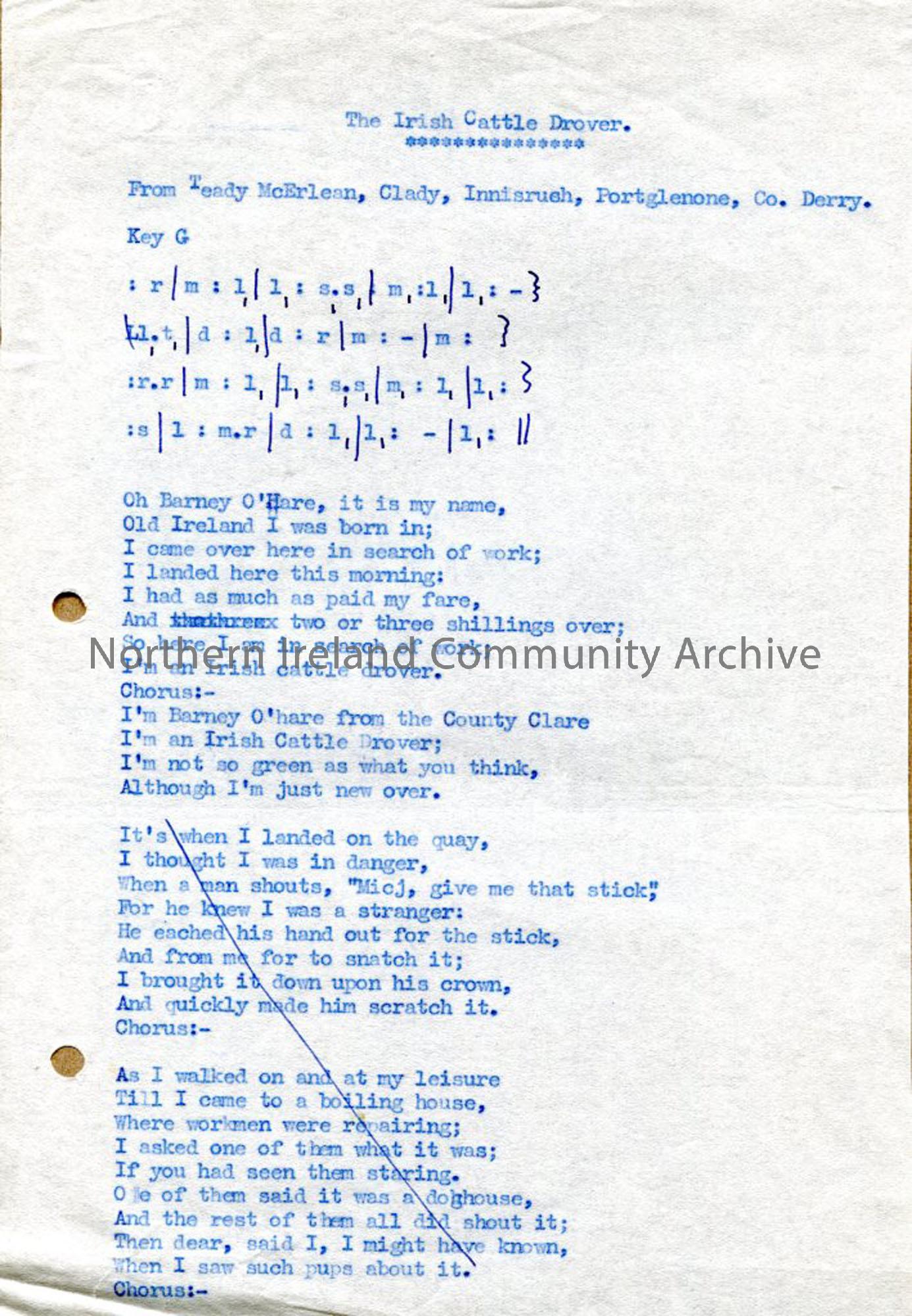 Typed tonic sol-fa notation and words to 'The Irish Cattle Drover'.
