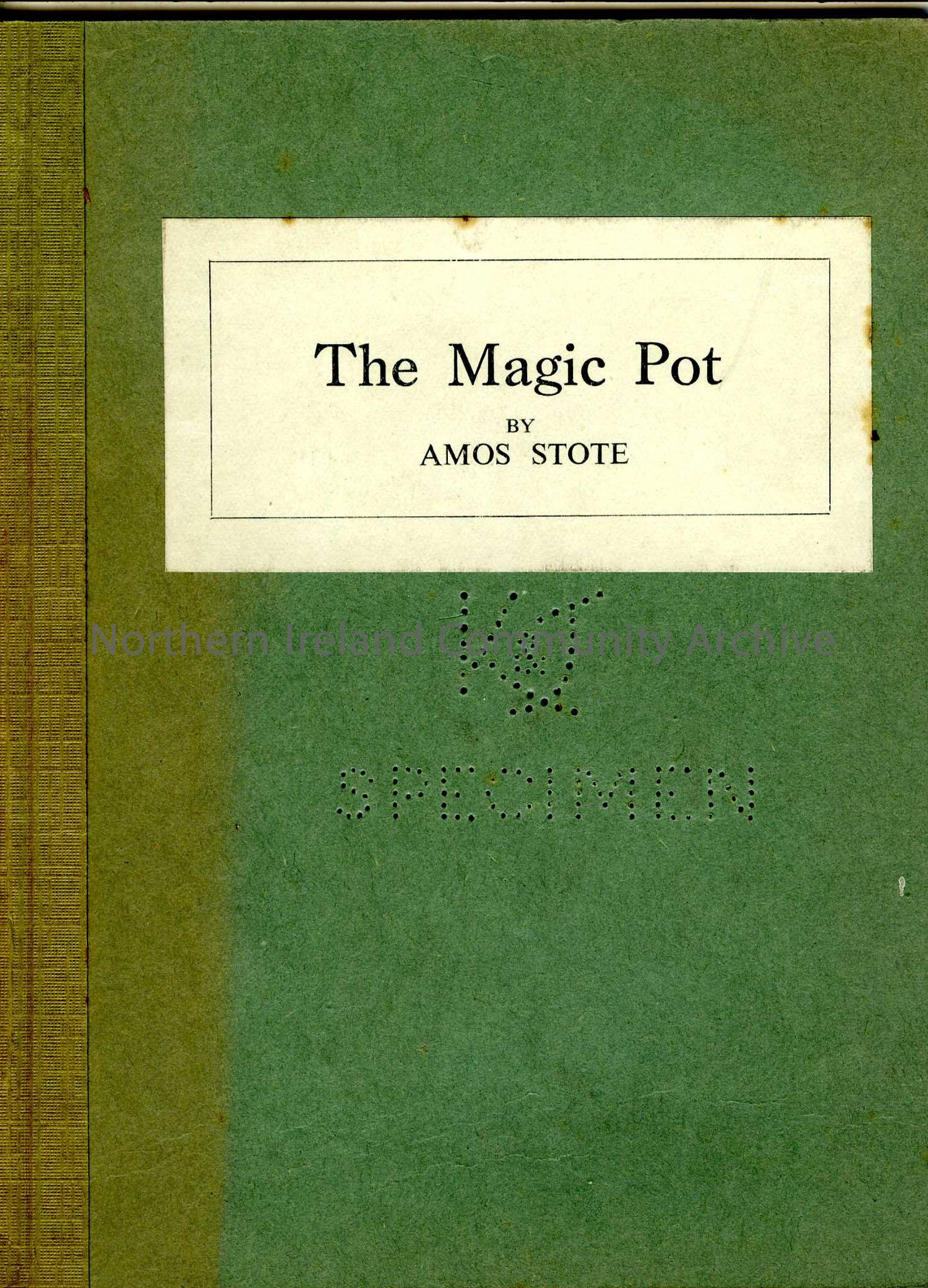 The Magic Pot - a small book about the history of whiskey making and the Jameson factory in particular. cover punched with holes to form "KandJ SPECIMEN"