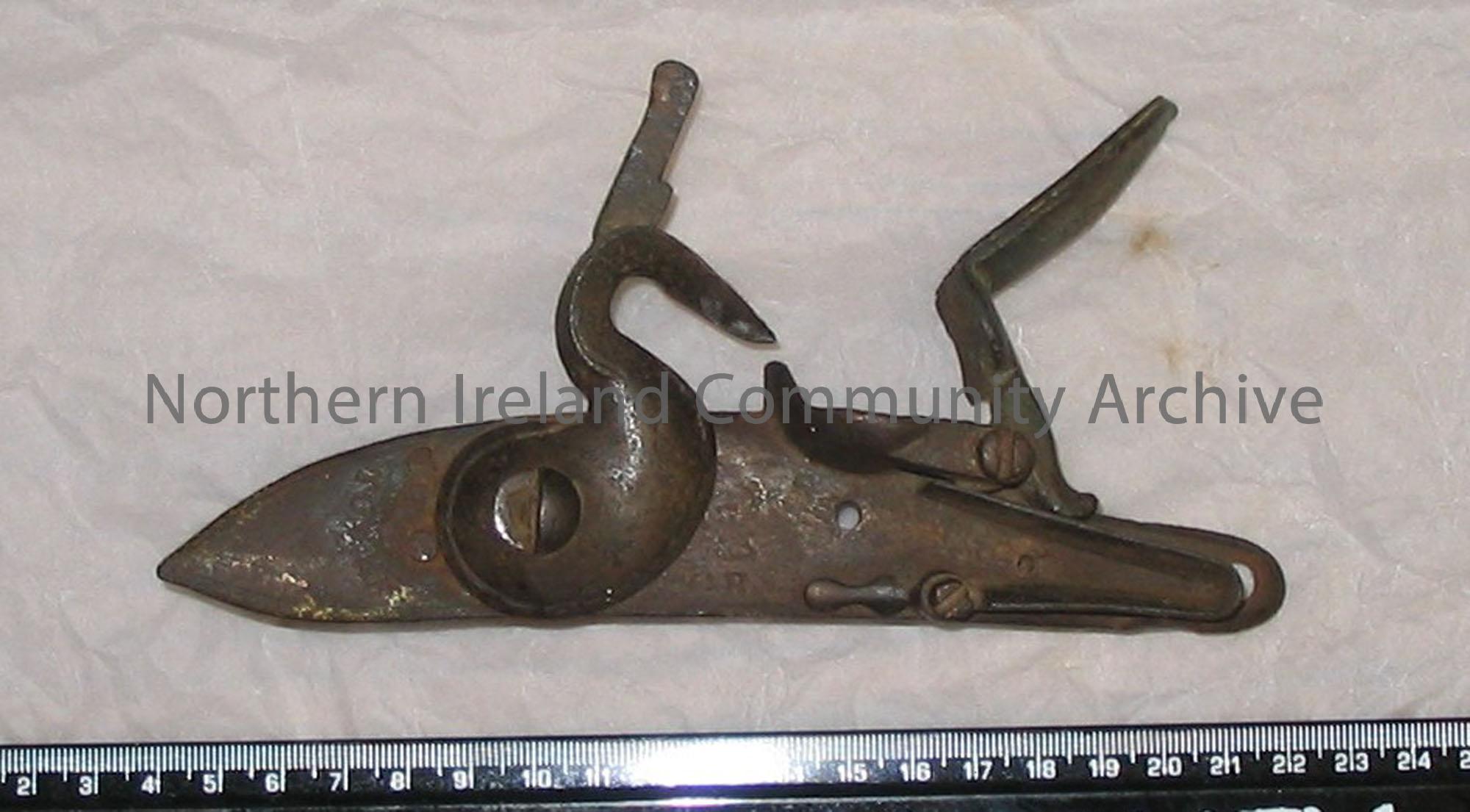 The mechanism for a flint lock musket rifle, possibly a 'Brown Bess'; almost complete, except that the upper fixing to hold the flint is missing; gunsmith marked as 'TOWER', and there is also a Crown and 'GR' clearly marked; early 19th century; found at a farm in Dunavenny