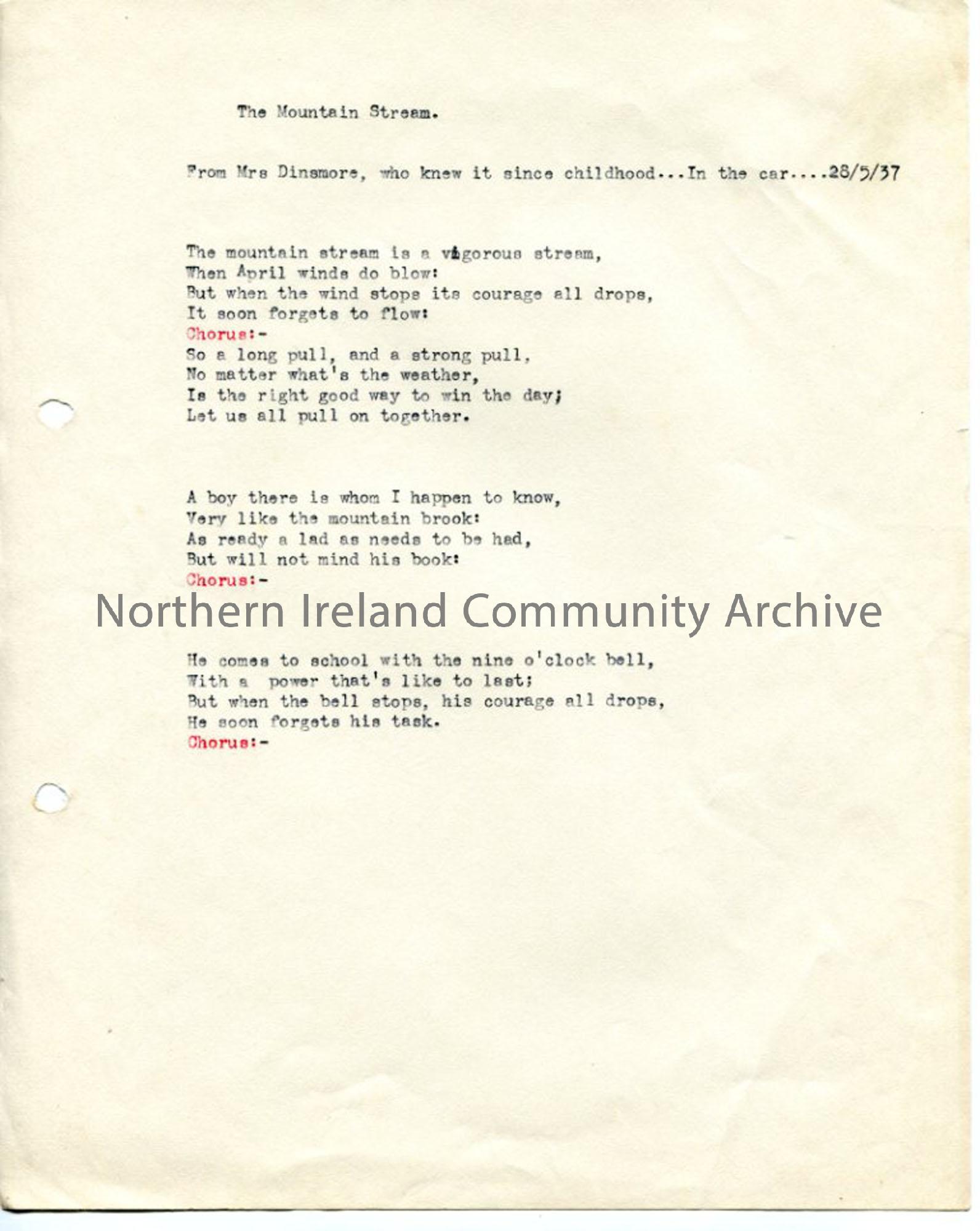 Typed words to 'The Mountain Stream'. 'From Mrs Dinsmore, who knew it since childhood...In the car...28/5/37.