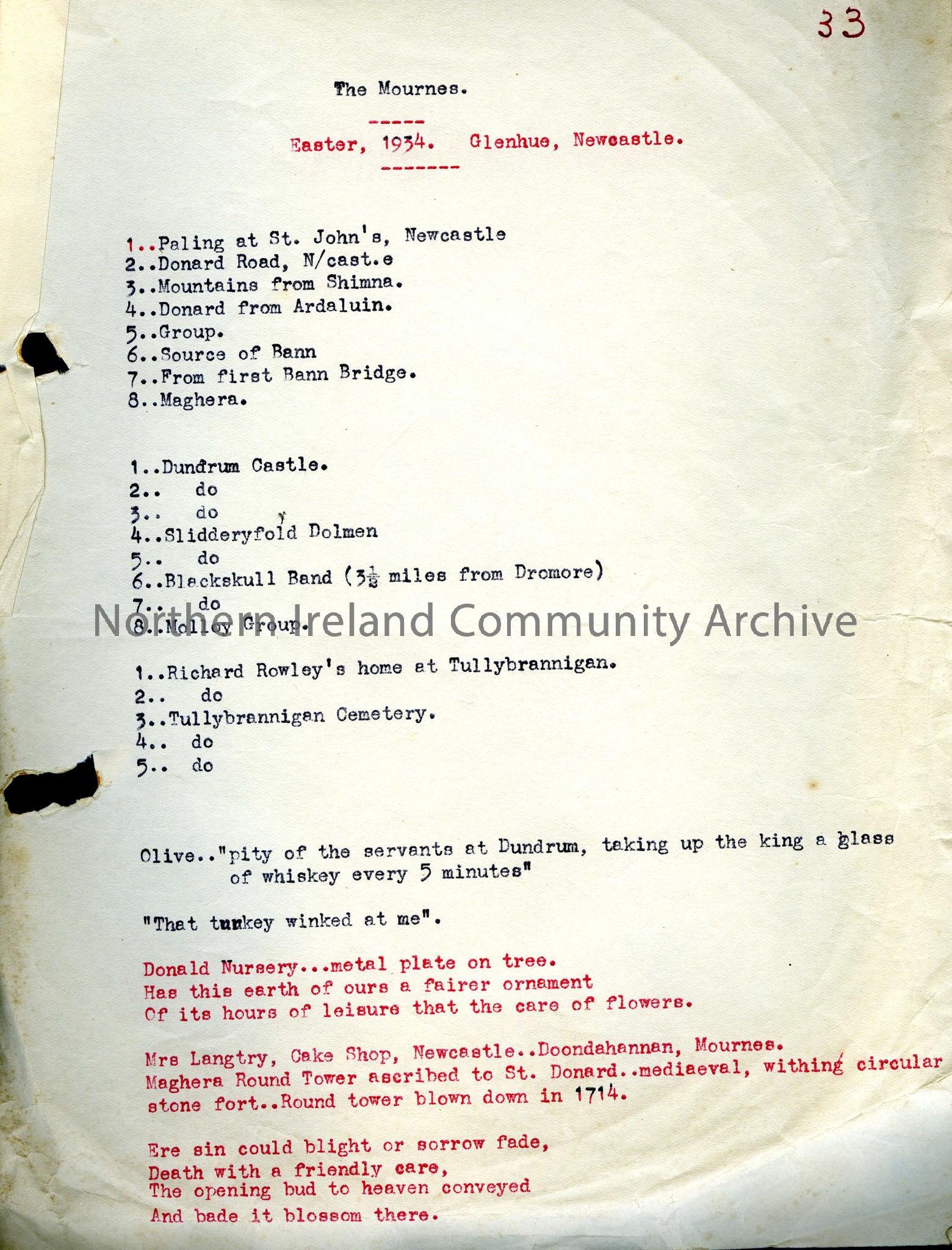 The Mournes - Easter, 1934, Glenhue, Newcastle. Seems to relate to the contents of film reels taken there.