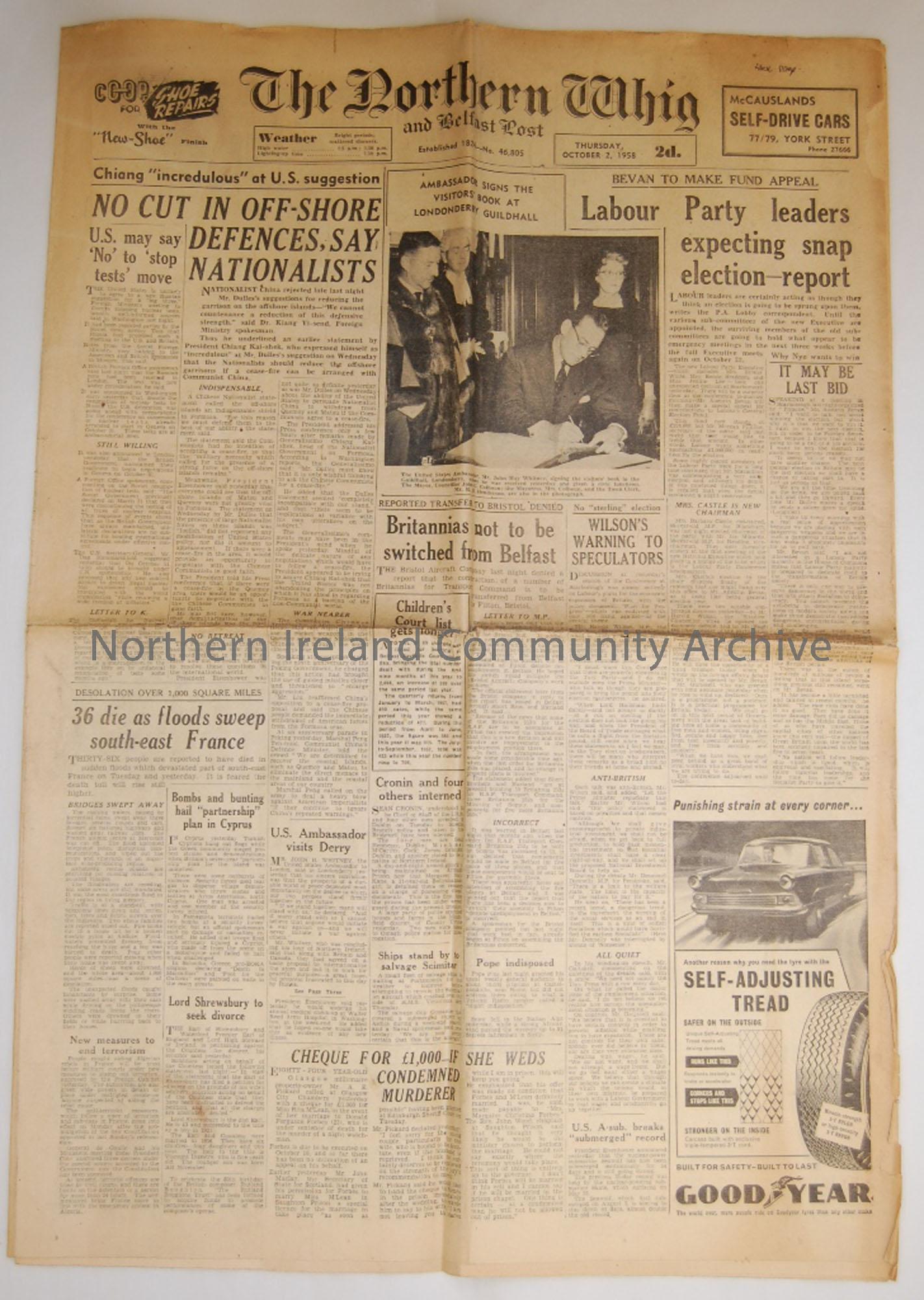 The Northern Whig. Thursday October 2. 1958. No. 46,805. Last copy. Price 2d.