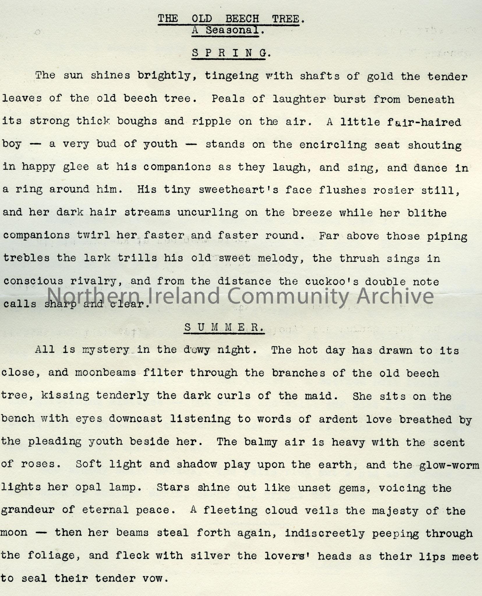 Original typescript in envelope titled, The Old Beech Tree by Mrs, Spielmann. With envelope addressed to Mrs. H Thomson. Signed by 'Mabel H Spielmann' on second page of letter