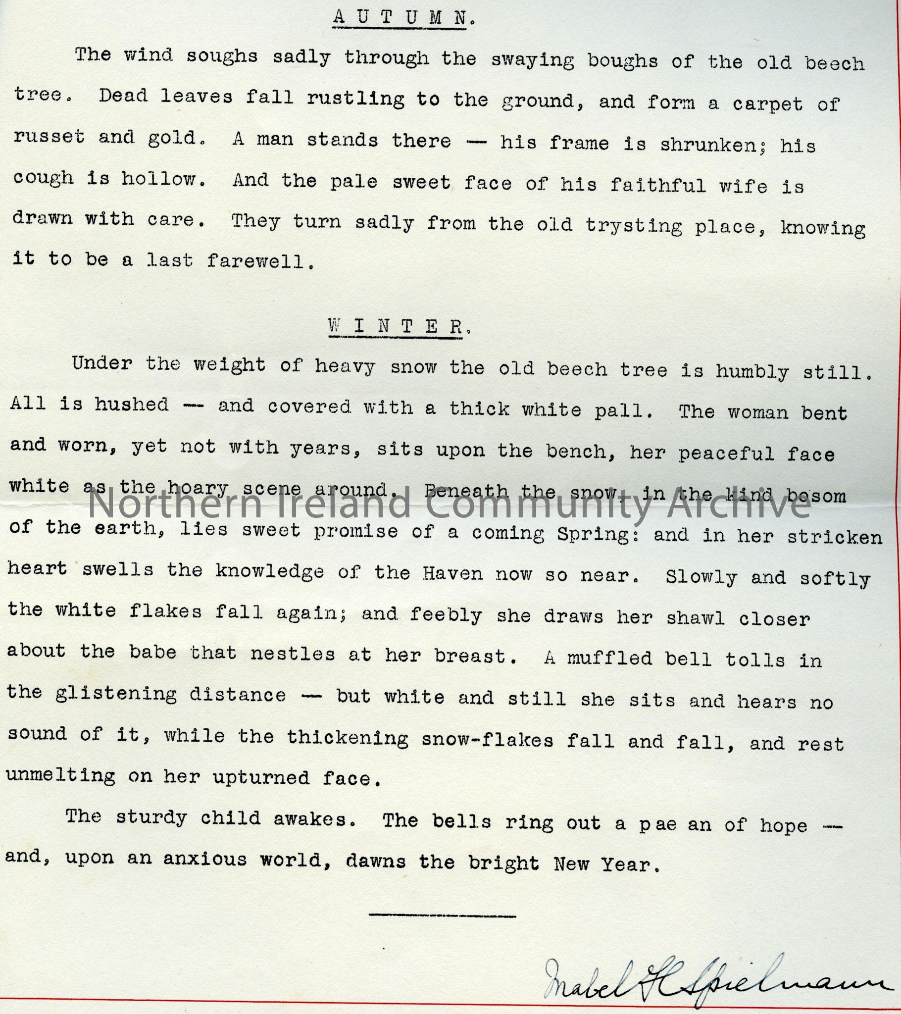 Original typescript in envelope titled, The Old Beech Tree by Mrs, Spielmann. With envelope addressed to Mrs. H Thomson. Signed by 'Mabel H Spielmann' on second page of letter