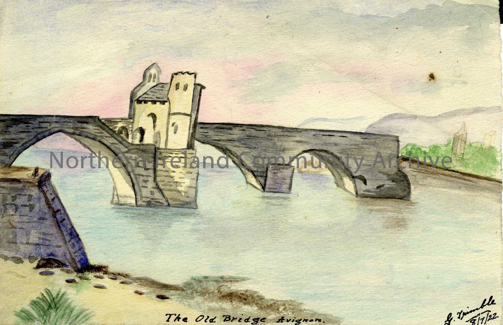 Small landscape watercolour titled, 'The Old Bridge Avignon' by Gertrude Trimble. A bridge is shown running accross a river, with a small castle like building sitting on the middle of it.