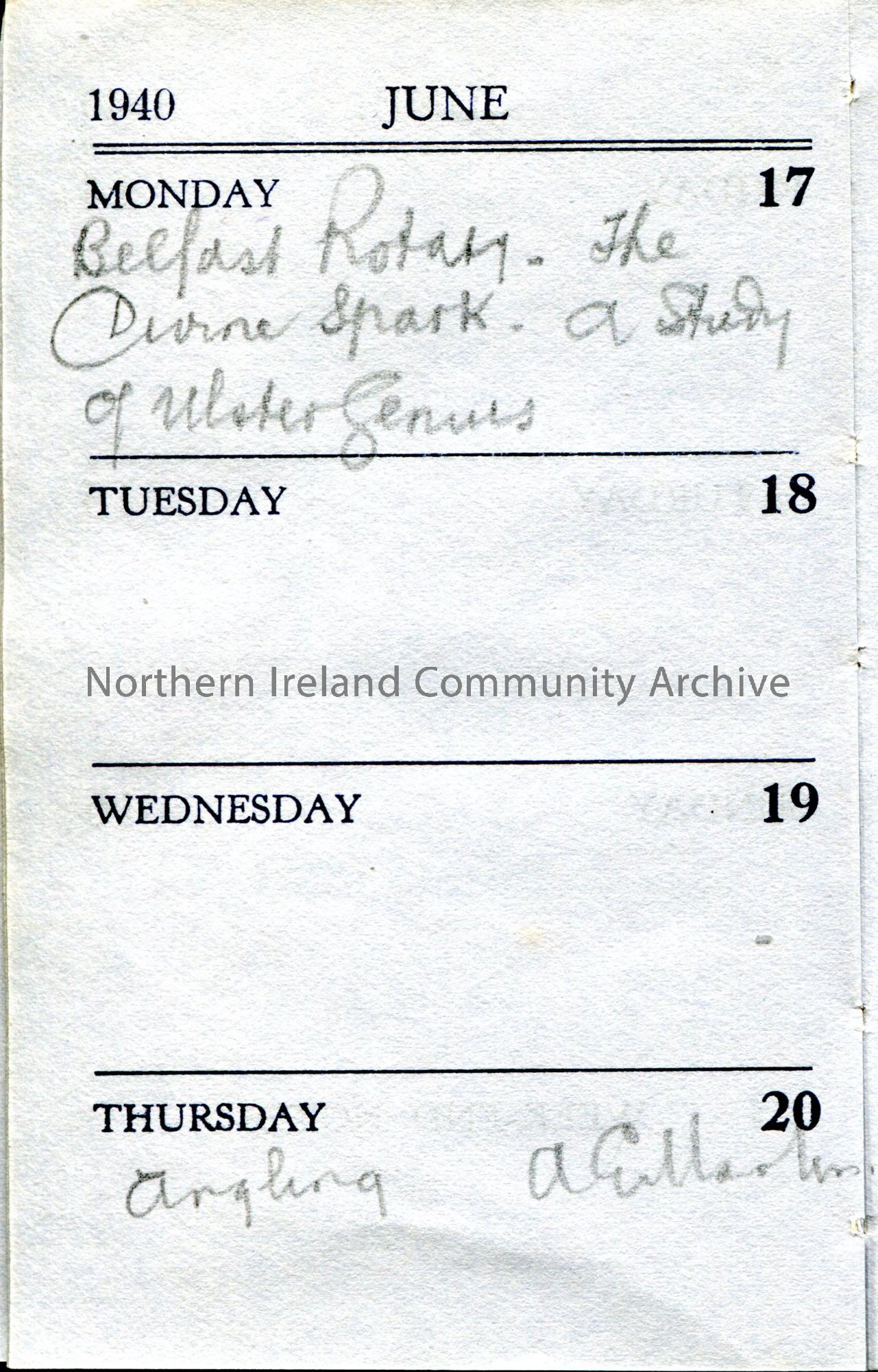 ‘The Piccadilly Diary’. Blue cover. Dated 1940. Belonged to Sam Henry. Various entries re broadcasts, Rotary. Appears to have had Council duties on Mo… – scan006b