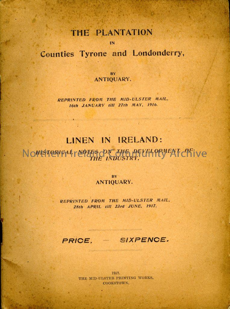 The Plantation in Counties Tyrone an Londonderry by Antiquary.Reprinted from the Mid Ulster Mail, 16th January till 27th May 1916 Linen in Ireland: Historical Notes on the Development of the Industry by Antiquary. reprinted from the Mid Ulster 28th April (6541)
