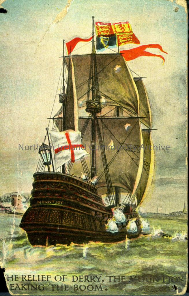 ‘The Relief of Derry, The Mountjoy breaking the boom’ is written on the front of the postcard underneath an image of the Mountjoy ship at sea. Printed…