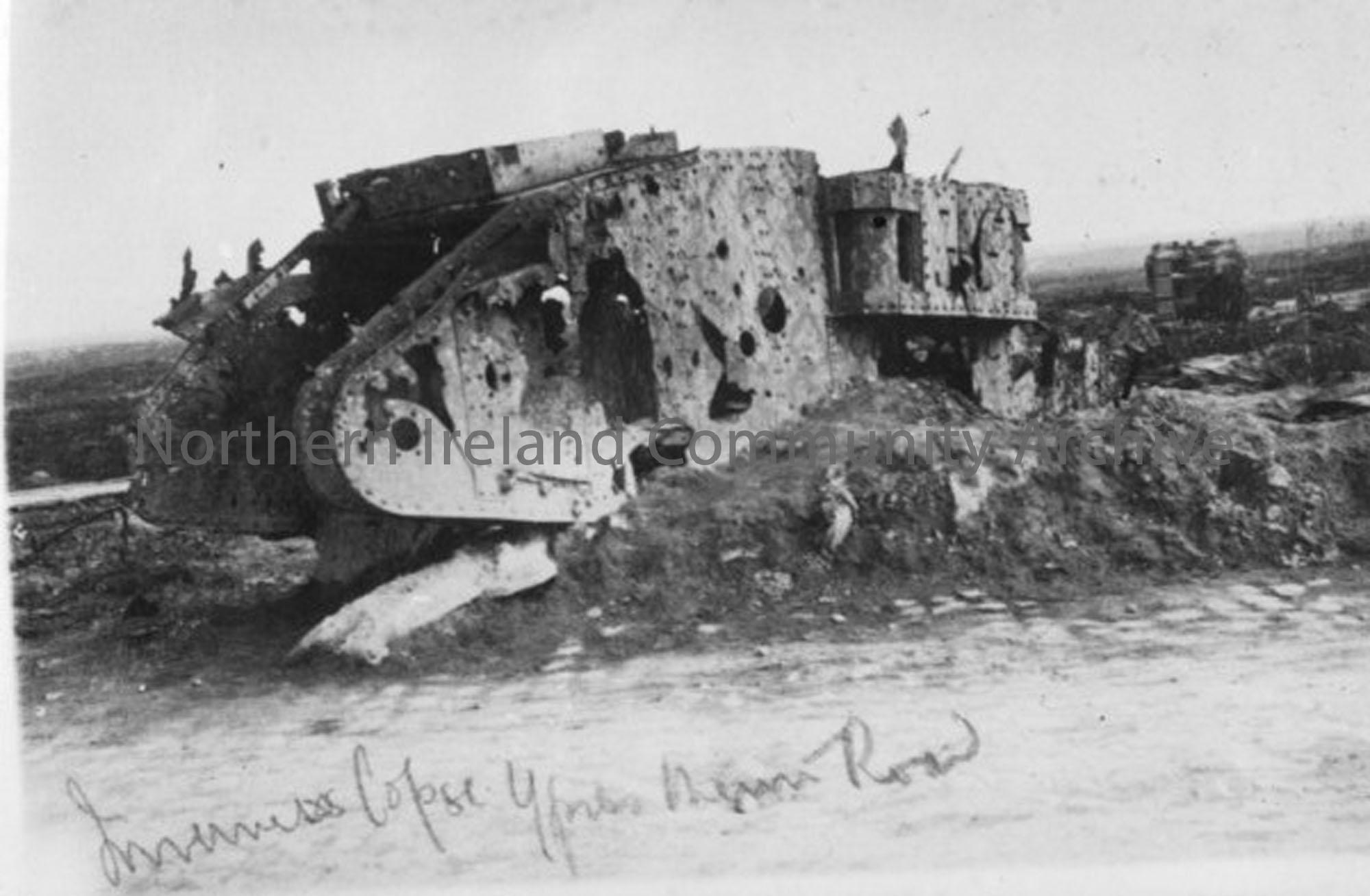 The remains of a British tank at Inverness Copse on the Ypres to Menin Road. These photographs are reproduced from the album of Major John C. Robb, Royal Army Medical Corps, 108th Field Ambulance, 36th Ulster Division.
