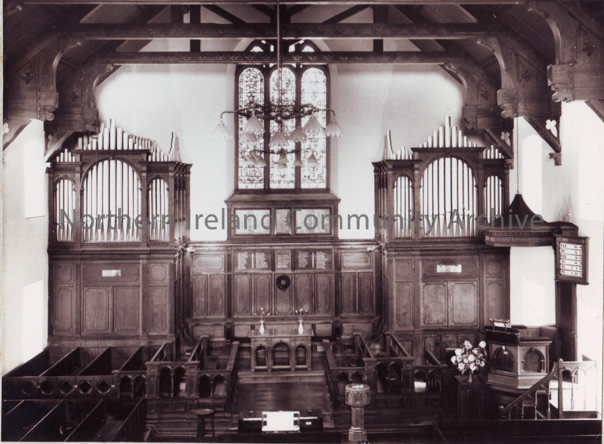 The Sanctuary created at the east end of the church in 1921, showing the new organ, choir stalls and east window with roll of honour below it