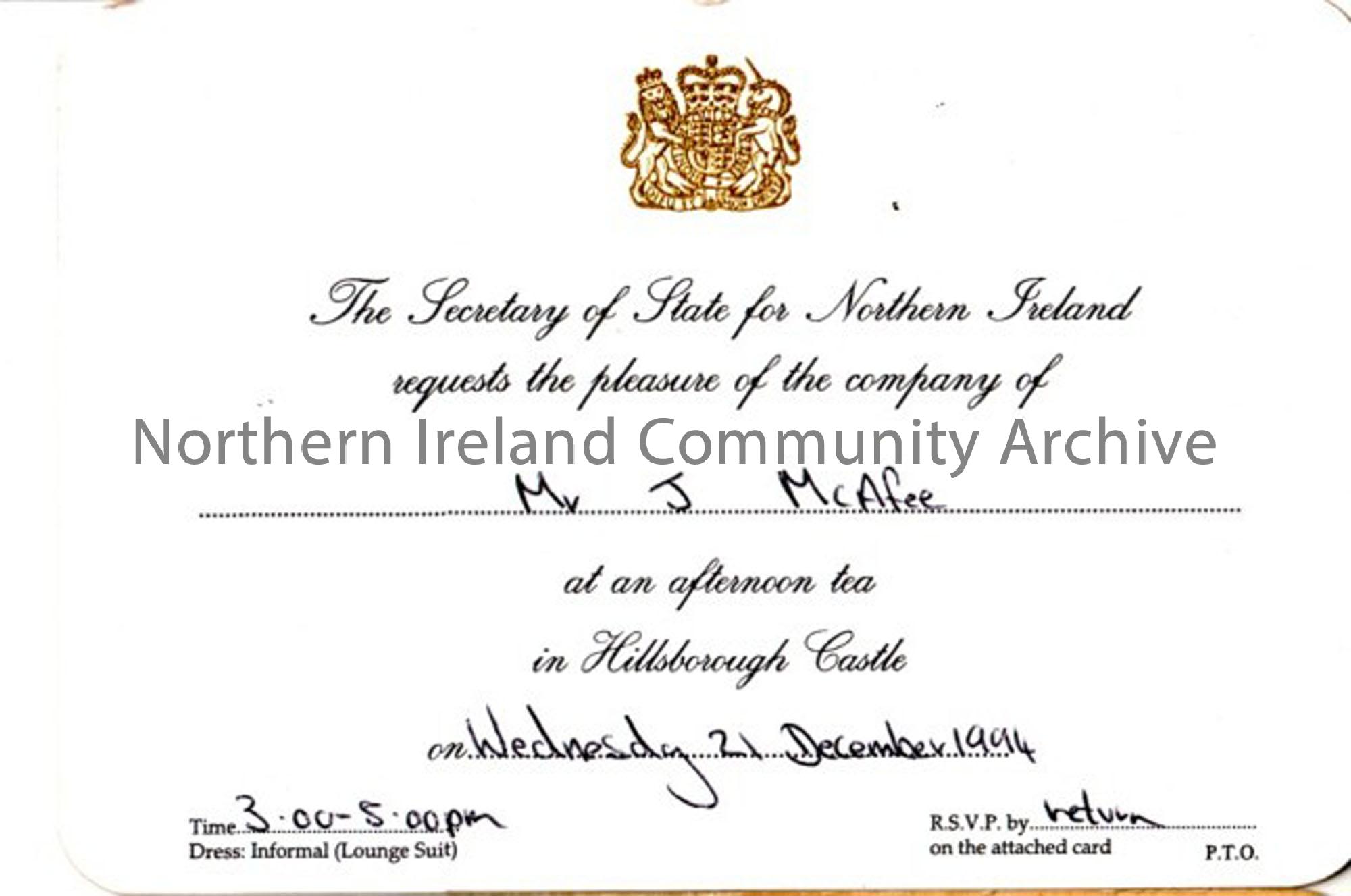 The secretary of the State for Northern Ireland requests the pleasure of the company of Mr J McAfee at an afternoon tea in Hillsborough Castle on Wednesday 21st December 1994.