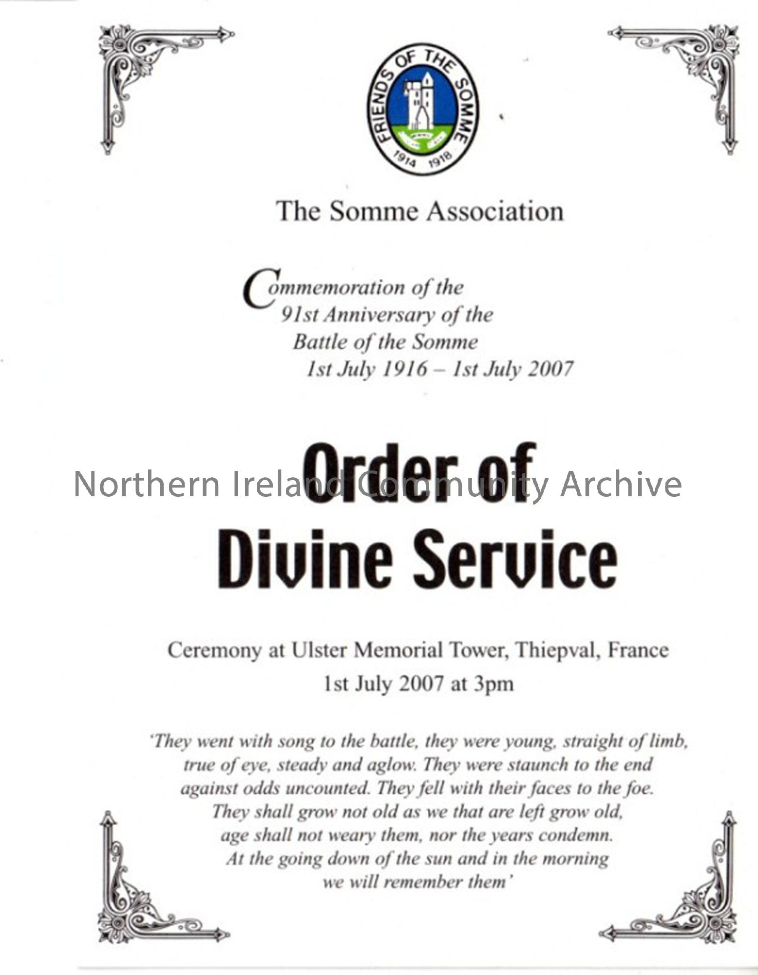 The Somme Association Commemoration of the 91st Anniversary of the Battle of the Somme 1st July 1916- 1st July 2007, Order of Divine Service. Ceremony at Ulster Memorial Tower, Thiepval, France, 1st July 2007 at 3pm.