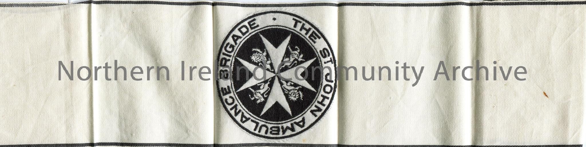 The St. John Ambulance Brigade armband. Black and white material, possibly cotton.
