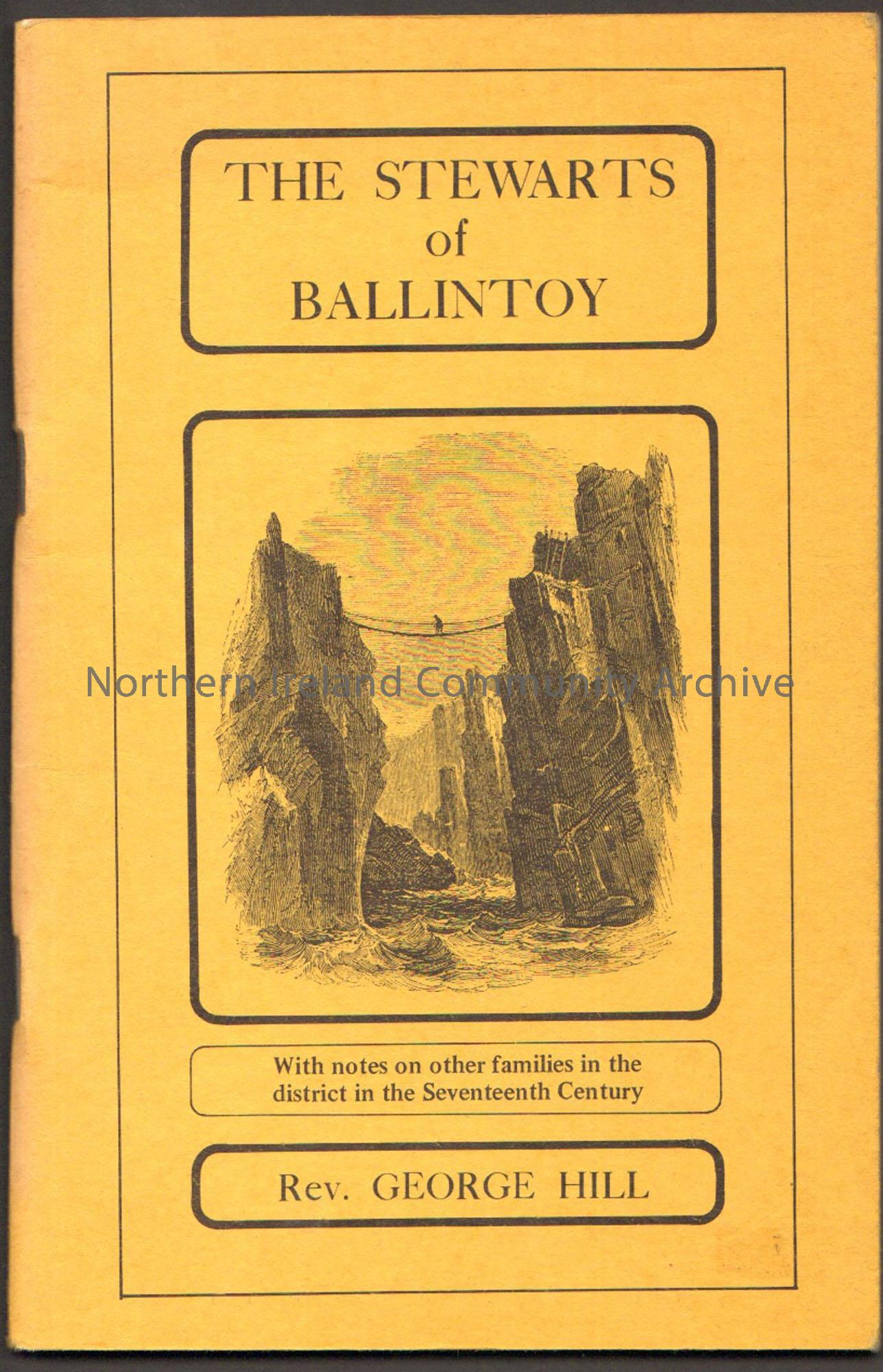 The Stewarts of Ballintoy by Rev. George Hill. Mustard coloured cover with a black sketch of a man crossing a rope bridge between to cliff faces over …