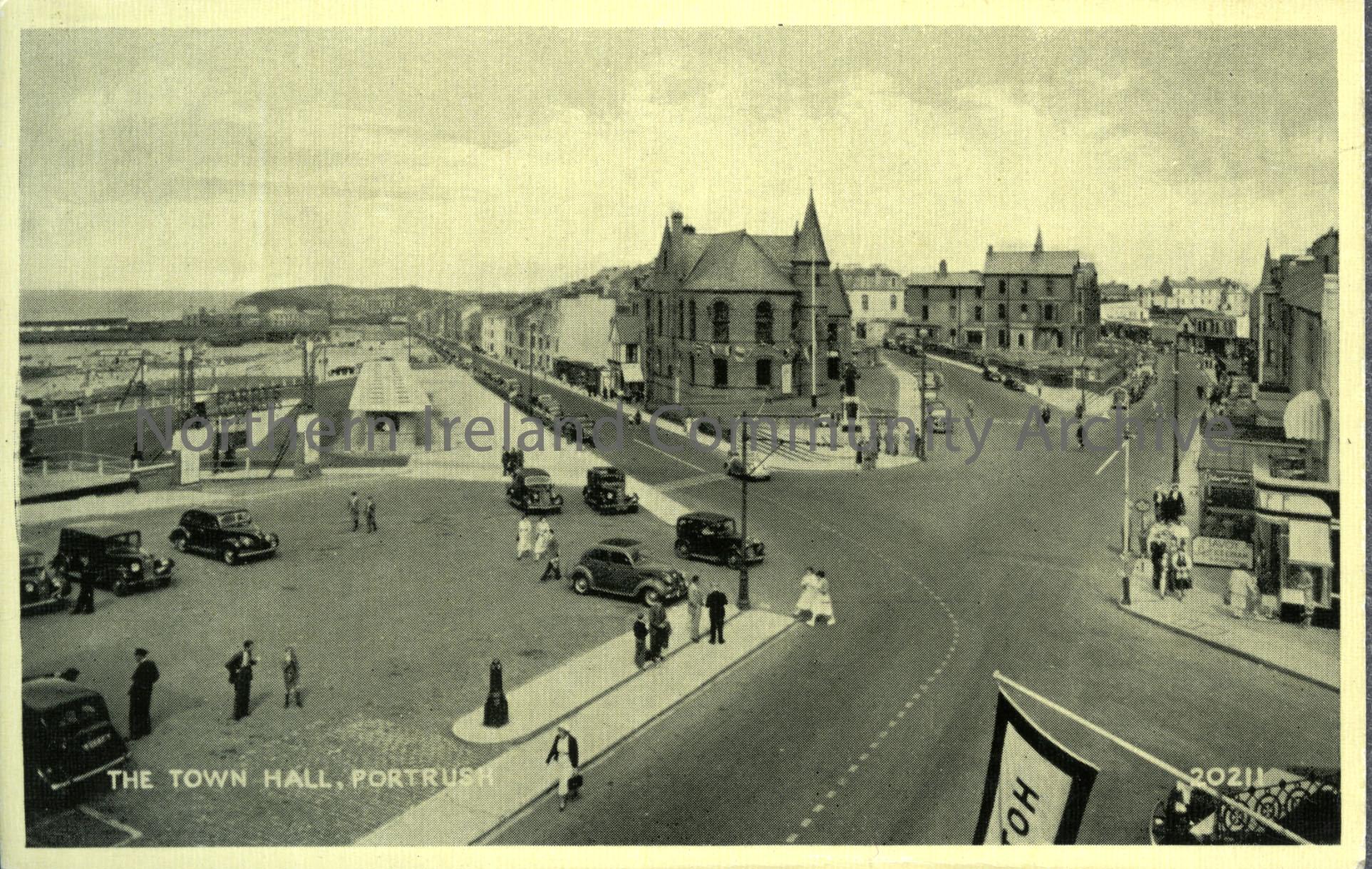 postcard titled, 'The Town Hall, Portrush.' Depicting cars, people, town hall and road
