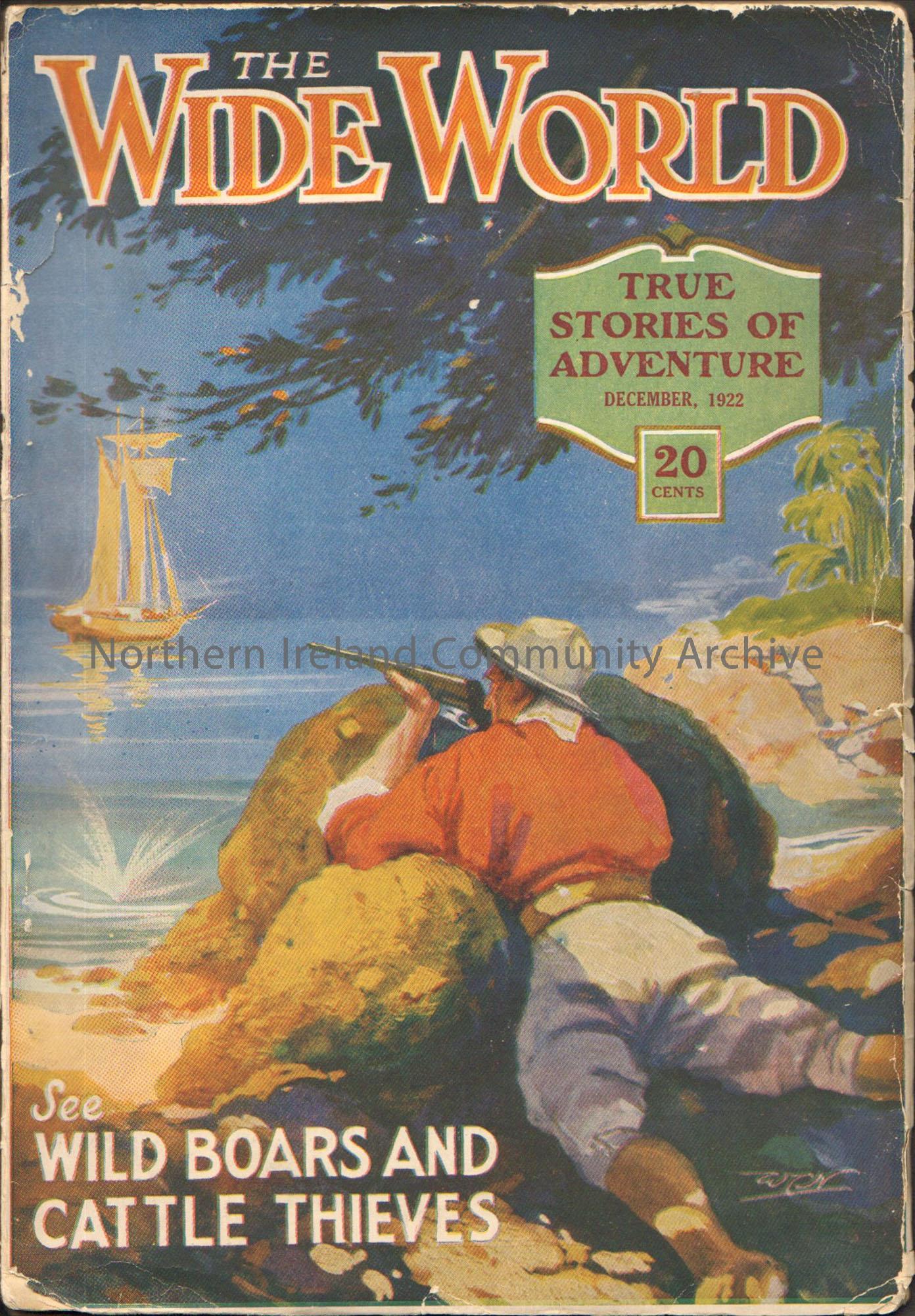 The Wide World. Picture of man in a red shirt leaning on a rock and aiming a rifle at a sailing boat on the front cover.