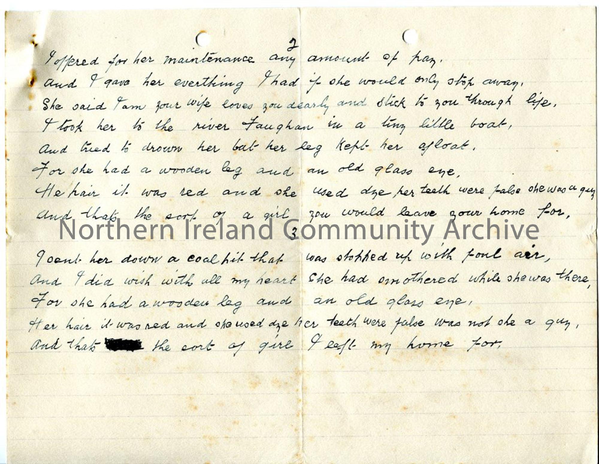 One of 3 pages of handwritten words to 'The Wooden Leg' - comical song