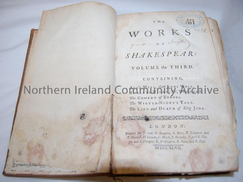 The Works of Shakespeare Volume the third. With the name James Smyth signed in ink on the front page. Property of Ballymoney Public Library.