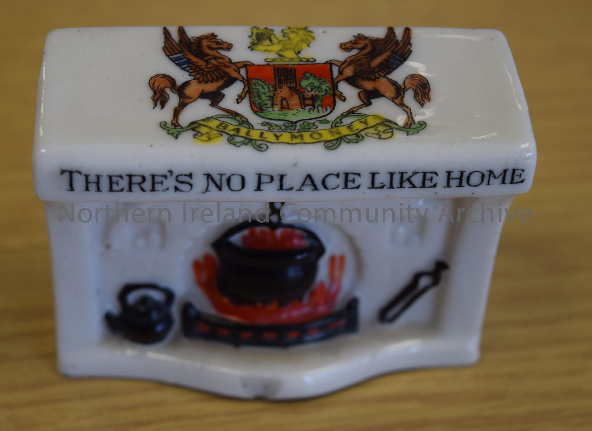 There’s No Place Like Home. White fire place with cauldron over a fire. Ballymoney coat of arms on the top. – 2015.47 (2)